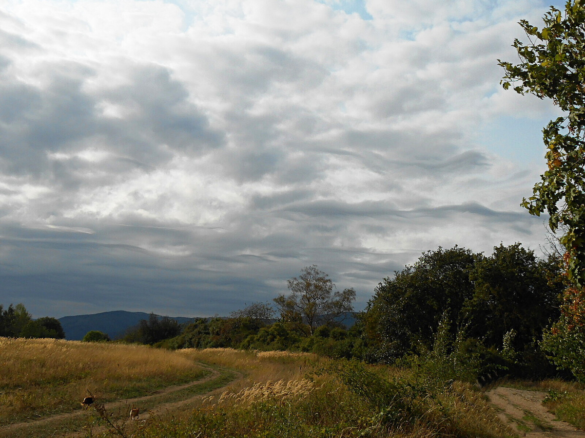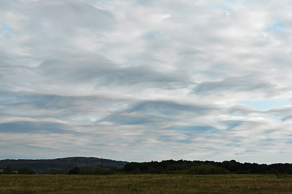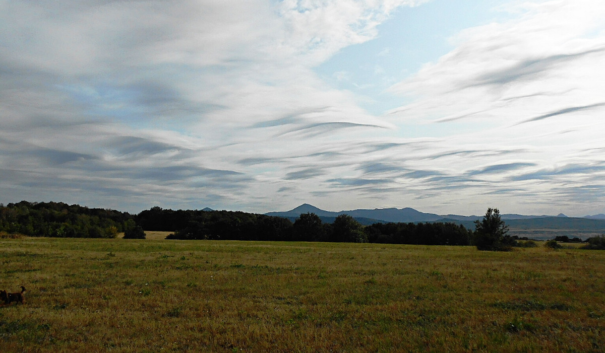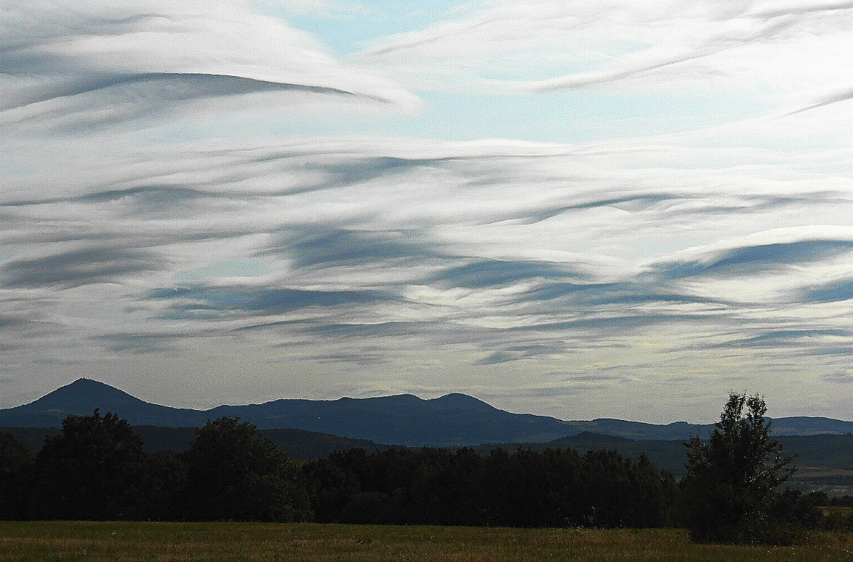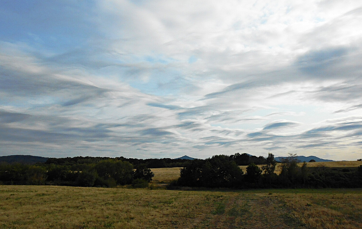Já vím, že jsem už asi otravná, ale nepodělit se s vámi o tu nebeskou krásu by mi bylo trochu líto. Co běhá po zemi a po stromech, mi moc fotit nejde, na ranní focení jsem líná a motýlů u nás moc nelítá, no a Říp je daleko. Nehledě na to, že nikomu nechci lézt do zelí. Vybrala jsem si tedy focení toho, co máme nad hlavou, a to je nebe. Tuhle odpoledne jsme po delší době vyjeli s pejsky na Střížovický kopec a jak jinak, foťák jel se mnou. Byla jsem moc ráda, že ho mám, protože matička příroda se fakt snažila. Takové mračení umí jen ona.