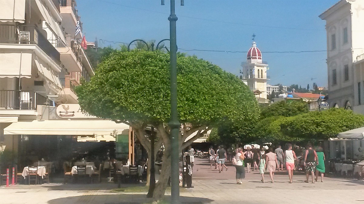 Malý plácek, na něm kašna. To je bod, kde je třeba se rozhodnout. Pokud zamíříte doleva, dostanete se na ulici, na níž je shromážděno nejvíce obchodů. Ale pozor, obchody tady mají o víkendech zavřeno. Ve všední dny jsou otevřeny od devíti do čtrnácti, večer pak jen v úterky, čtvrtky a pátky. Tady se totiž život nepřizpůsobuje turistům. Tato ulice s názvem Alexandrou Roma je normální nákupní zóna, kam chodí místní obyvatelé. Není primárně zaměřená na turisty jako obchody se suvenýry v letoviscích u moře, kde je běžné, že je otevřeno od rána do půlnoci včetně sobot a nedělí. Ne, Zakynthos je město, kde vidíte normální běžný řecký život, tady turista není středobodem světa a to je dobře. Ulice přechází v náměstíčko plné kaváren a taveren, z něj se pak dá jít vpravo směrem v moři. A uvidíte velký přístav, nejdůležitější část města. K němu dojdete i pokud se v bodu rozhodnutí u kašny nedáte vlevo na nákupní třídu, ale půjdete stále rovně. Tak i tak, všechny cesty tu vedou k přístavu.
