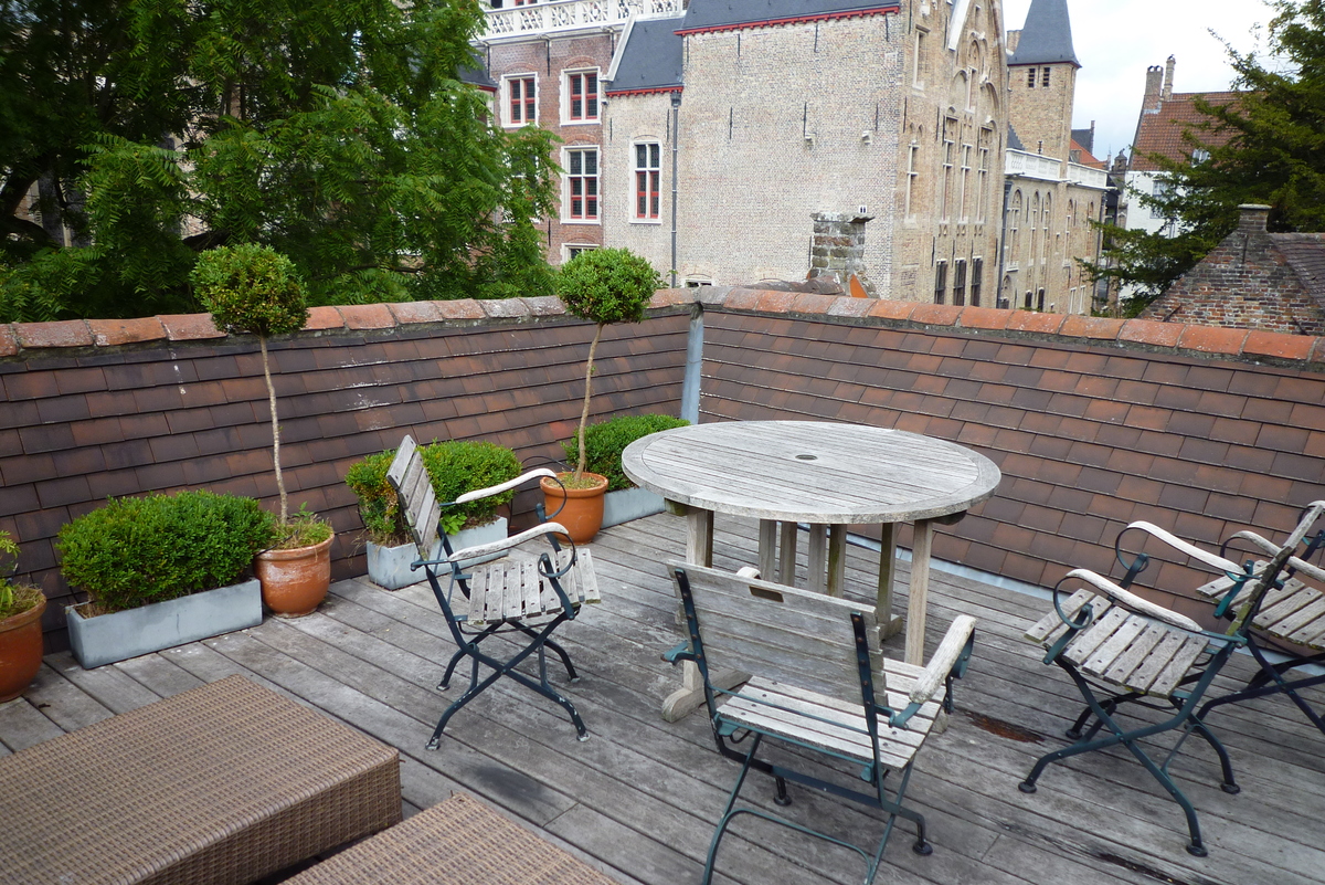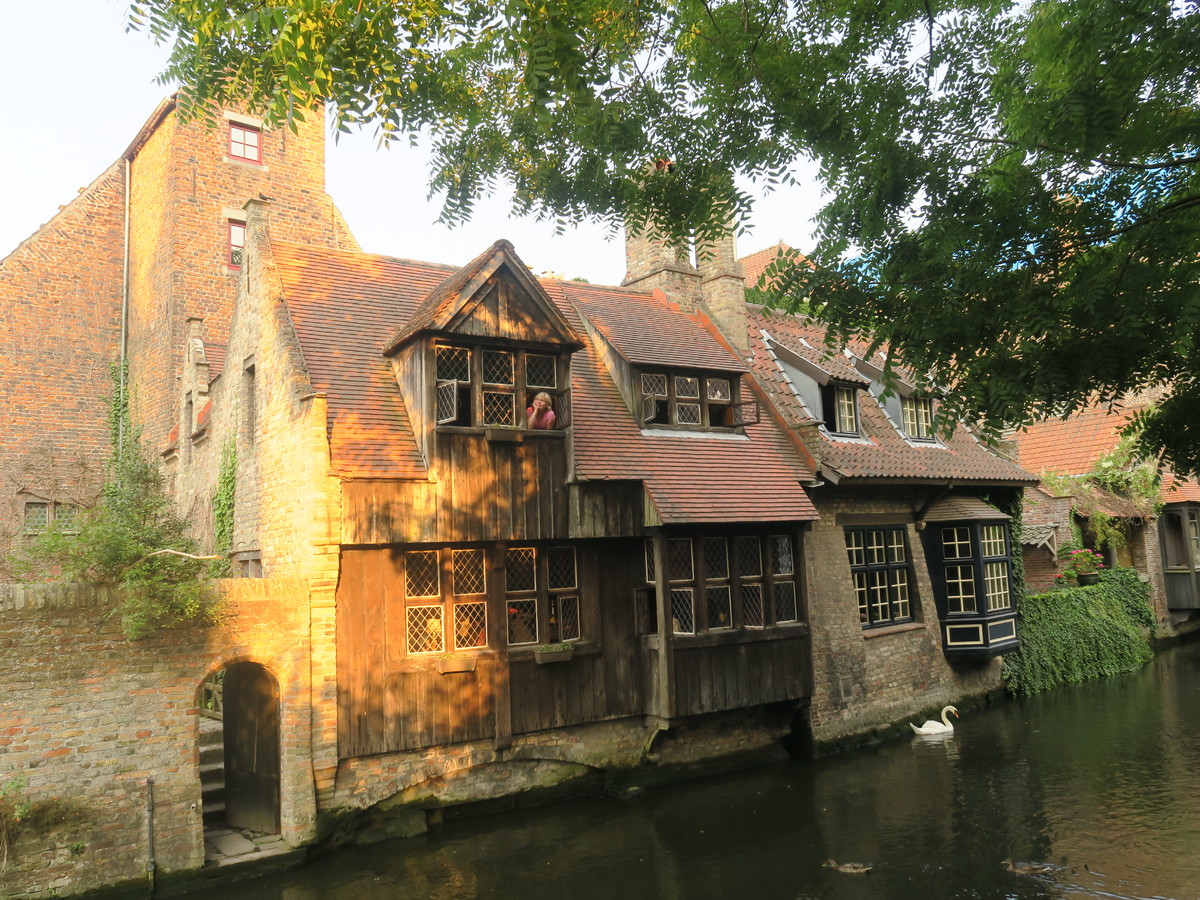 V samém srdci historického centra, v bezprostřední blízkosti kamenného můstku Bonifacius byl i náš stejnojmenný hotýlek. Půvabný domeček s úchvatným výhledem na vodní kanál a kostel Panny Marie se slavnou Madonnou od Michelangela Buonarroti.. Všechny body Lenčina e-mailu se shodovaly. Opravdu jsme ráno snídaly a mávaly turistům na lodičkách přímo pod našimi okny. A ti si nás nadšeně fotili a natáčeli, jakoby nevěřili svým očím, že v tom dřevěném domečku může někdo bydlet. Opulentní snídaně připravovala sympatická majitelka Lynn osobně, včetně sklenky šampaňského, ve kterém se každé ráno koupala čerstvá malina…