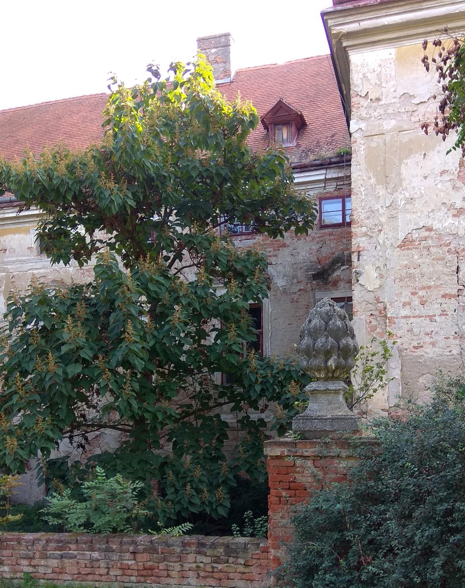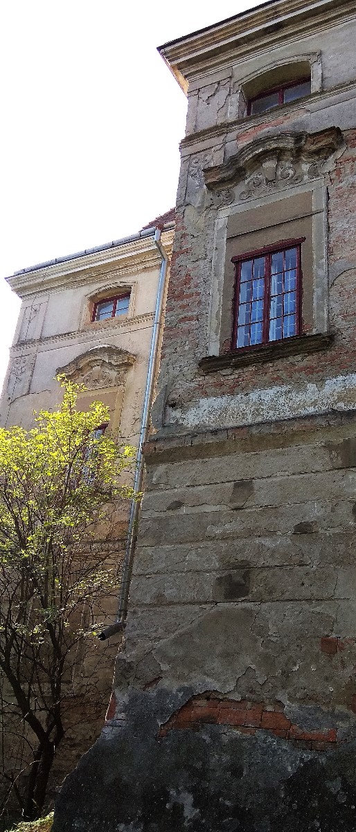 Byla jsem překvapená, v jaké míře je pro mne bolestné vidět, jak se doslova před očima rozpadá ta renesanční čtyřkřídlá jednopatrová budova s hranolovou věží a arkádami kolem čestného dvora a vnější rozsáhlou jižní lodžií (viditelnou z obce pod zámkem), jak chřadne ta někdejší monumentální stavba zušlechtěná v 17. století italským stavitelem Domenicem Martinellim a v 18. století barokními úpravami podle Josefa Emanuela Fischera z Erlachu. Slzy se mi draly lítostí do očí, neboť ten jedinečný skvost, kdys patřící říšským hrabatům von Spee, posledním zodpovědným vlastníkům, má opět od roku 2004 soukromého vlastníka (rakouský neurolog a psychiatr Sigurd Markus Hochfellner z Ebernsteinu u Klagenfurtu), ale stav zámku není viditelně lepší, než jaký zůstal po užívání Československou armádou po roce 1948. Ještěže ta moje malá princezna tiše a spokojeně spí. Vidět tu hrůzu, měla by velké starosti, aby si brokátové sukně perlami posázené a dlouhé závoje až na zem neurousala.