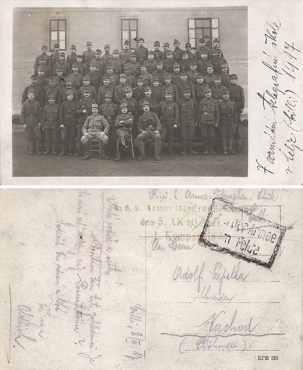 Avšak to přece vůbec není konec celého příběhu! Narukoval na italskou frontu, byl i na „slavné“ Piavě a v horských průsmycích. Naštěstí byl přece jen nad průměrem obyčejných pěšáků: měl měšťanku, výborně mu šly jazyky, snadno se učil a jako houslista měl obratné prsty. Nedivme se proto, že jej odveleli do telegrafní školy, takže se stal telegrafistou a nemusel na nikoho střílet. (Všimněte si té zajímavosti na pohlednici. Nejde o poznámku u fotografie, tu tam táta připsal po válce. Ale té adresy: Adolf Čepelka, krejčí, Náchod, Čechy. To stačilo.)