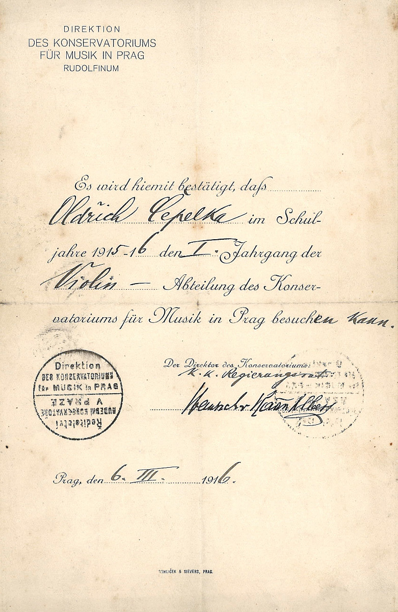 A pak jednoho dne přišel překvapivý dopis – pozvání od princezny Alexandry von Schaumburg-Lippe na náchodský zámek. Oldřich si sbalil housle, vyšplhal na zámecký kopec a před princeznou a jejím doprovodem zahrál. Princezna byla hrou mladého houslisty natolik okouzlena, že mu na místě nabídla stipendium ke studiu na Pražské konzervatoři. Kluk z chudé rodiny, napůl samouk… a teď takové štěstí! (I já jsem po nějakých 103 letech od události na tátu pyšný.)