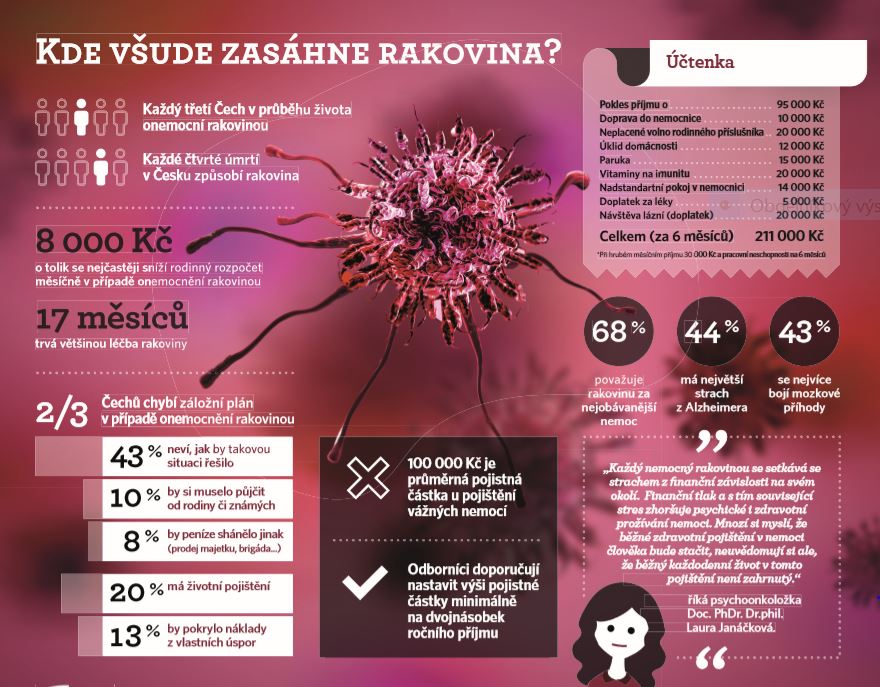 Až polovina Čechů si připouští možnost, že by mohla rakovinou onemocnět. Vedle rakoviny máme největší strach z Alzheimera a stařecké demence (44 procent) i mozkové příhody (43 procent), vyplývá z průzkumu Pojišťovny České spořitelny. Léčba rakoviny trvá v průměru 17 měsíců a nemoc ukrojí z rodinného rozpočtu 8 000 korun každý měsíc, přitom pojištěný je pro tento případ jen každý pátý Čech.