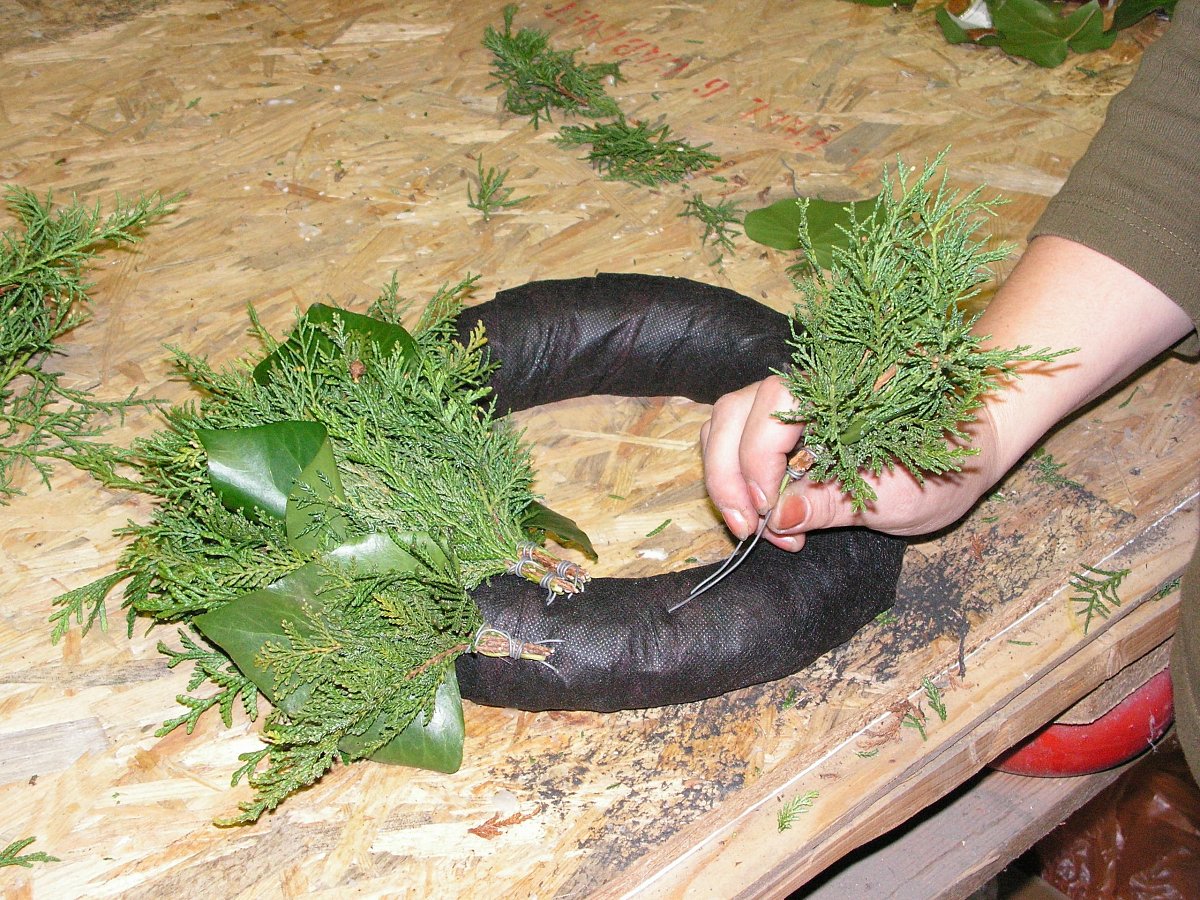 Na připravený základ připevněte snítky jmelí, zimostrázu, tisu, cesmíny, mahonu, bobkovišně, jalovce, jedlovce nebo jedle. Z krátkých větviček uděláte štětičky svázané drátkem, jehož volné konce zapíchnete do podkladu, a potom ohnete na druhou stranu po směru hodinových ručiček. Jednodušší postup představuje uchycení větviček pomocí drátku obtáčeného současně kolem nich a korpusu. V obou případech je nutné pokládat zeleň tak hustě, aby nebyl vidět podklad, ani drát.