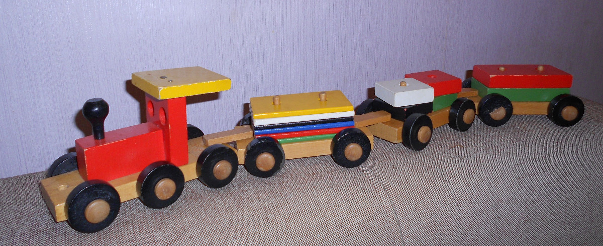 Uprostřed dárků stojí dřevěný vláček.
