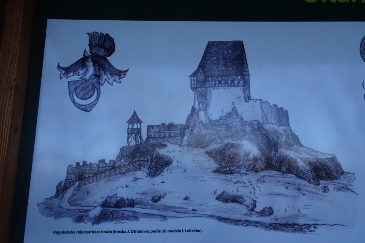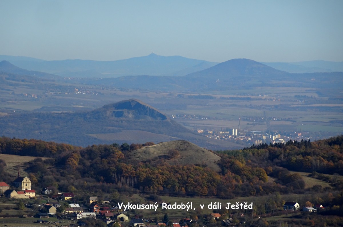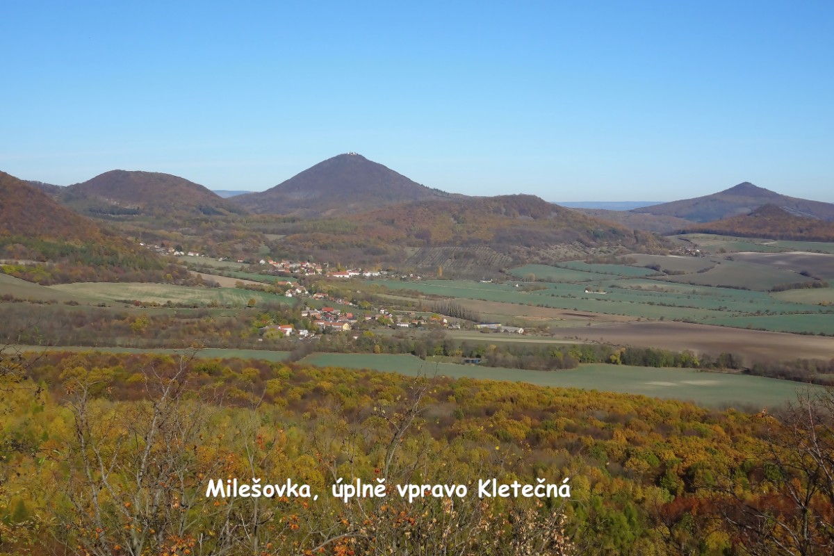 Vrátím se do 31. října, kdy se udělalo krásné počasí s viditelností, která slibovala nevšední zážitky. Toho jsem beze zbytku využila. Putování jsem začala v obci Děkovka, nad kterou se zvedá kopec se zříceninou hradu Oltářík, zvaný též Hrádek. Cesta se otáčí po úbočí kopce a mezi stromy se náhle objeví zbytky hradu. Na informační tabuli je vyobrazená rekonstrukce toho, jak asi hrad kdysi vypadal. Dnes z něho opravdu mnoho nezbylo, leč rozhled je nádherný. Pode mnou leží kopce a kopečky roztodivných tvarů, včetně nejvyšší hory Českého středohoří Milešovky, v dálce se od jihu rýsují kopečky na Lounsku Milá, Raná, skoro v zákrytu trojice Oblík, Srdov a Brník, dále na východ Hazmburk a nad rovinatou krajinou vystupující Říp. Severně nad Holým vrchem a Radobýlem vidím dokonce vzdálený Ještěd. Přímo pode mnou leží jako namalovaná cesta, která mě ještě čeká. Totiž z Děkovky se vydám kolem obory s Plešivcem přes Vlastislav a Sutom na Košťálov a z něho dolů do Třebenic. Krásný den nevylákal nahoru jen mě, ale potkávám se tam s dalšími turisty. Dívkou se psem, která zasněně hledí dolů a nechává se ode mě ochotně vyfotografovat. Až doma na fotkách jsem zjistila, že plechovku od limonády, která se v prostoru hradu povalovala, měla předtím v ruce ta sympatická dívčina. Moje sympatie rázem pohasly. Oltářík je přístupný celoročně a žádné vstupné se tam neplatí.