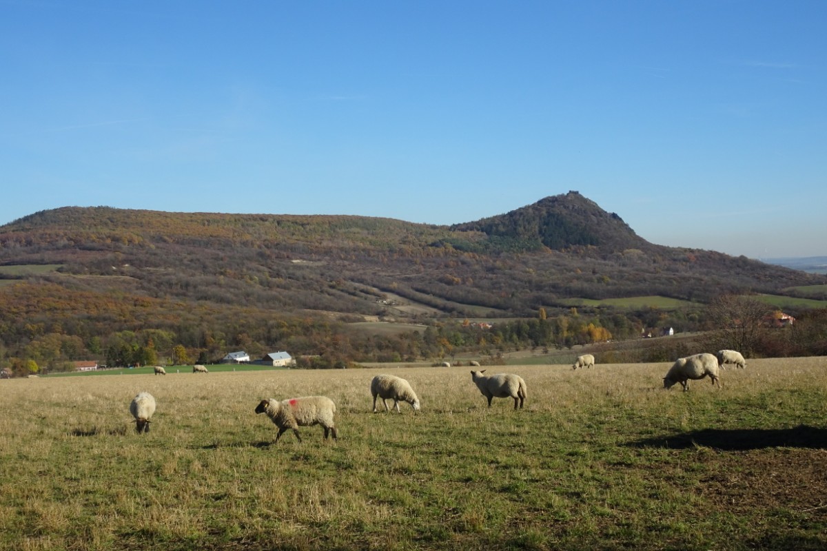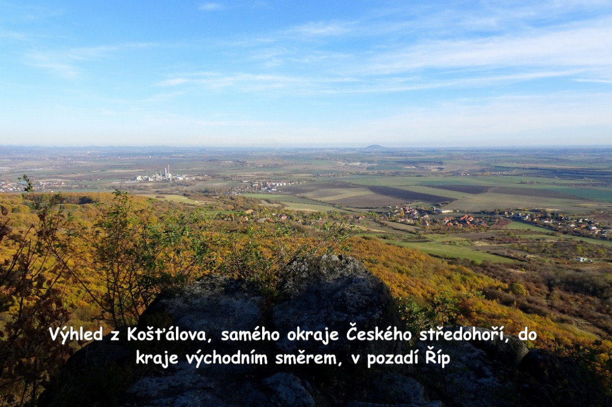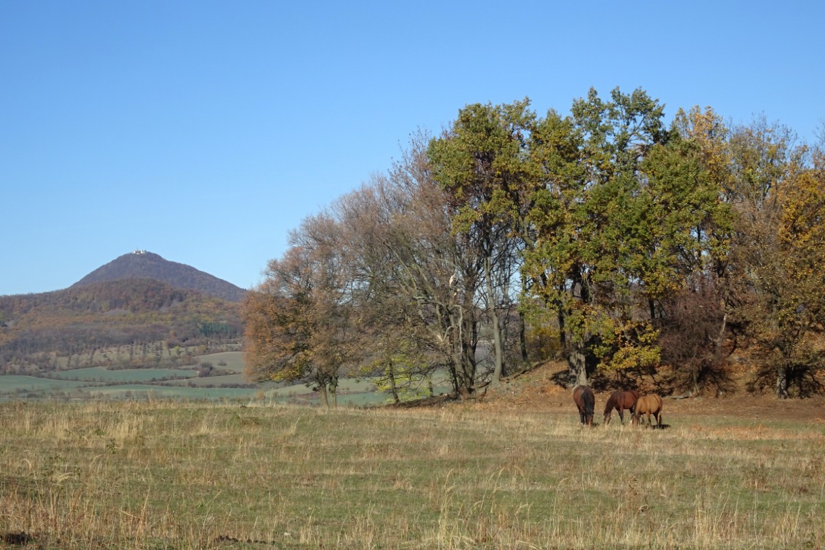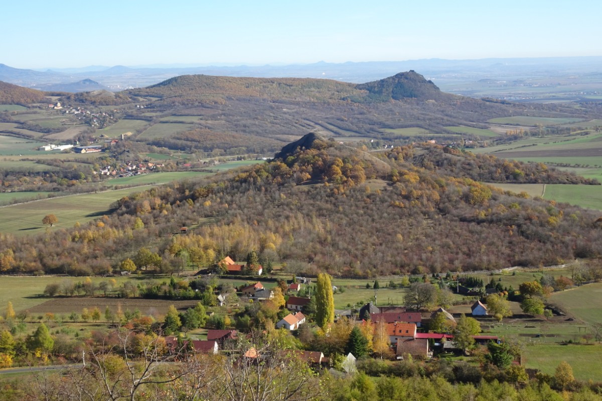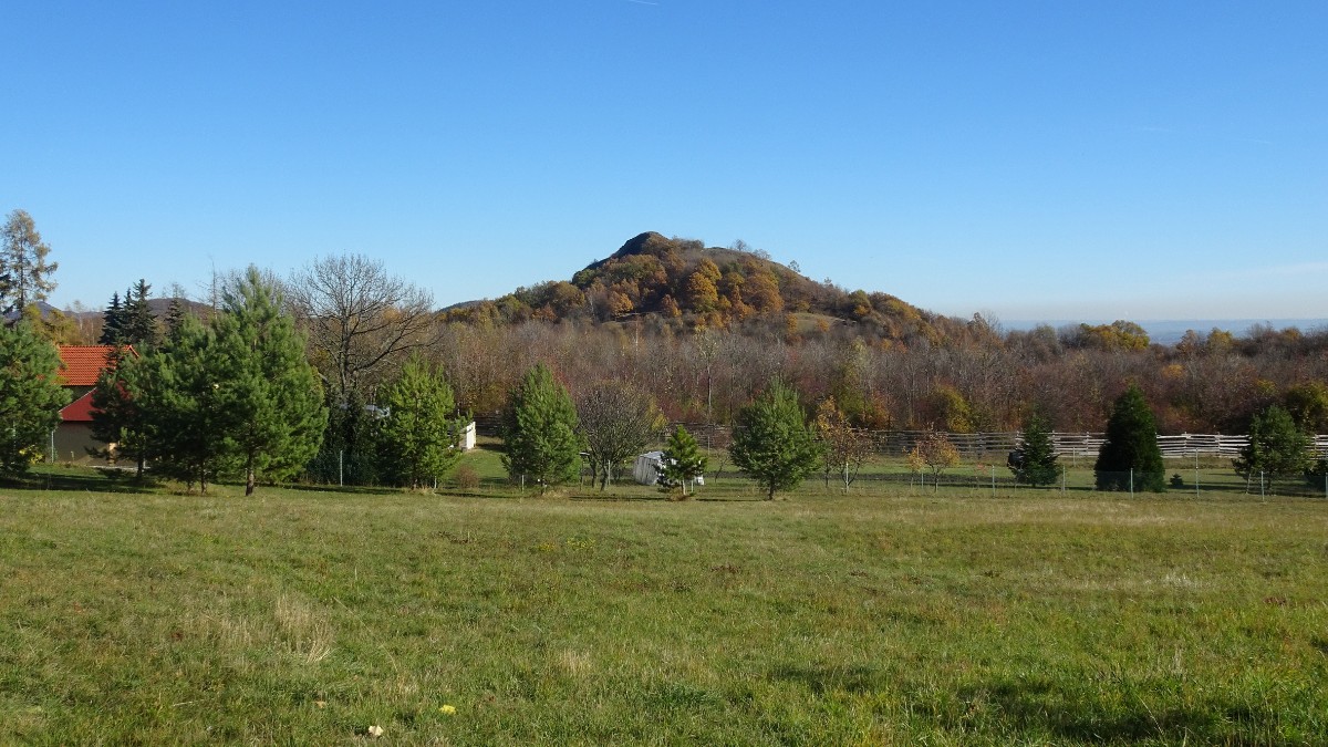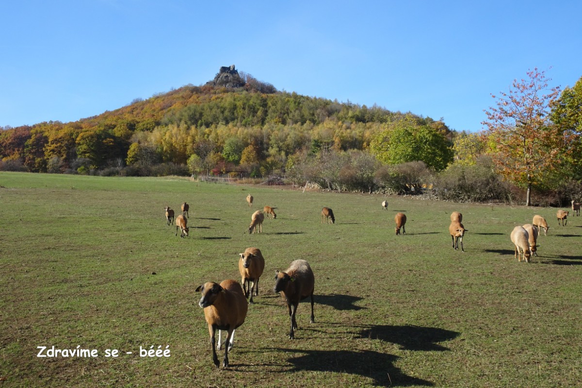 O osadě Chrastná jsem neměla ani potuchy. Zjevila se jako duch, prošla jsem ji raz dva a cesta vede dál mezi pastvinami. Slunce nad hlavou, kolem dokola kopečky, pasoucí se ovečky, co víc si přát? Obec Vlastislav leží v údolí, projdu ji a musím se pak vydat znovu do vrchu. Zvědavá jsem na zdejší zříceninu Skalka. Leč zastavilo u mě auto s jedním z turistů z Oltáříku a zve mě dovnitř. Abych se prý nemusela trmácet do vršku. Skalku tedy míjím za oknem auta, nechávám si ji na příště a řidič mě vysazuje v Sutomi. Odtud pokračuji dál lesem až k hradu Košťálov. Vrch Košťál je svým charakteristickým zubatým tvarem nepřehlédnutelnou dominantou panoramatu Českého středohoří a vystoupat na něj patří téměř k turistickým povinnostem. Plním ji ochotně a odměnou je mi opět nádherný výhled. Podobný jako z Oltáříku. A přece zase jiný. Tentokrát jsem tu úplně sama a vychutnávám si podzimně barevné moře lesů pode mnou plnými doušky. Hledím k obzoru k Řípu, kam se budu vracet.
