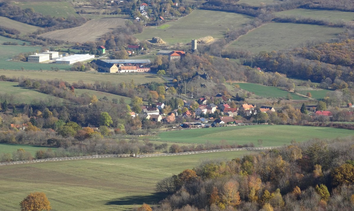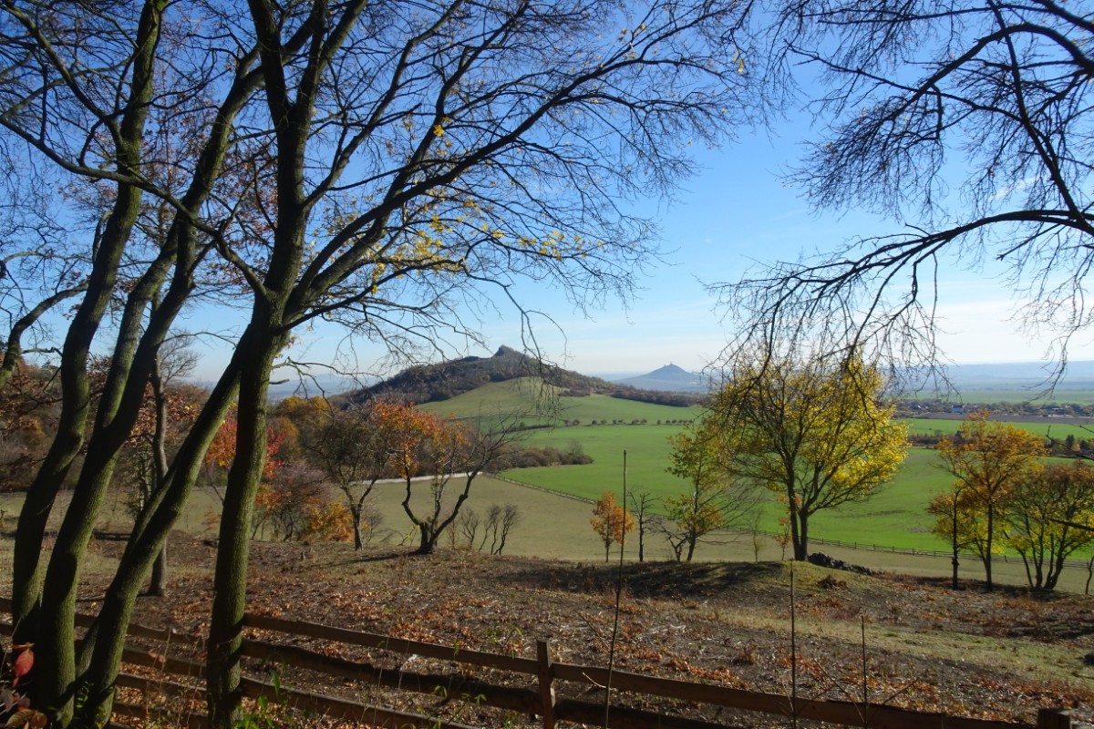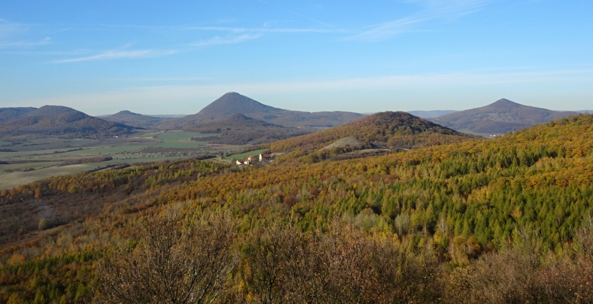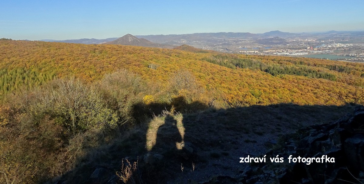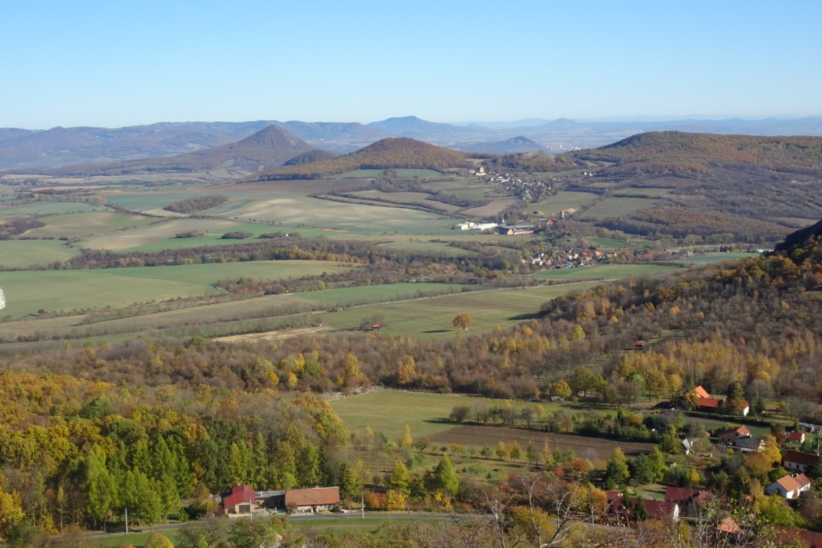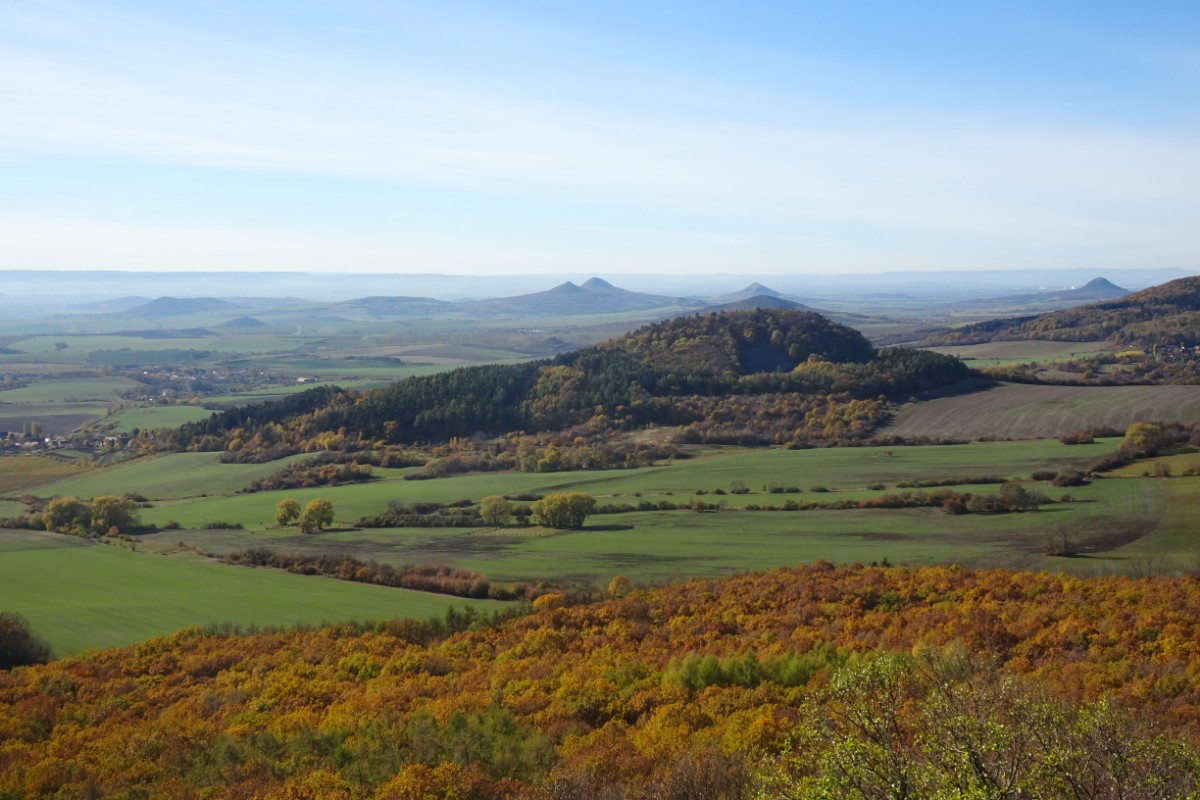 O osadě Chrastná jsem neměla ani potuchy. Zjevila se jako duch, prošla jsem ji raz dva a cesta vede dál mezi pastvinami. Slunce nad hlavou, kolem dokola kopečky, pasoucí se ovečky, co víc si přát? Obec Vlastislav leží v údolí, projdu ji a musím se pak vydat znovu do vrchu. Zvědavá jsem na zdejší zříceninu Skalka. Leč zastavilo u mě auto s jedním z turistů z Oltáříku a zve mě dovnitř. Abych se prý nemusela trmácet do vršku. Skalku tedy míjím za oknem auta, nechávám si ji na příště a řidič mě vysazuje v Sutomi. Odtud pokračuji dál lesem až k hradu Košťálov. Vrch Košťál je svým charakteristickým zubatým tvarem nepřehlédnutelnou dominantou panoramatu Českého středohoří a vystoupat na něj patří téměř k turistickým povinnostem. Plním ji ochotně a odměnou je mi opět nádherný výhled. Podobný jako z Oltáříku. A přece zase jiný. Tentokrát jsem tu úplně sama a vychutnávám si podzimně barevné moře lesů pode mnou plnými doušky. Hledím k obzoru k Řípu, kam se budu vracet.