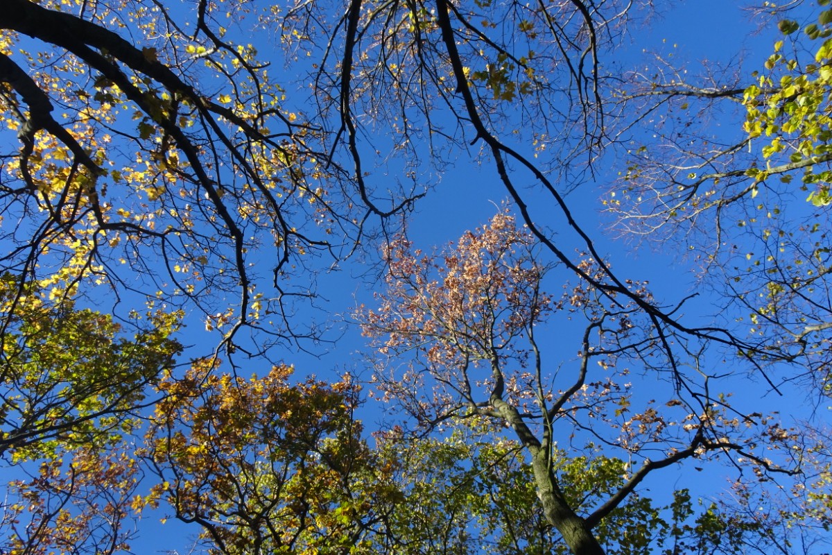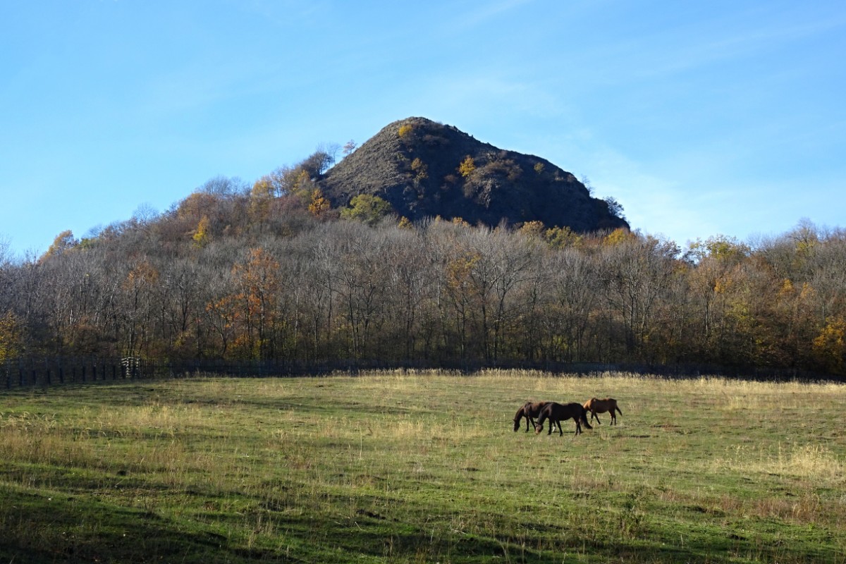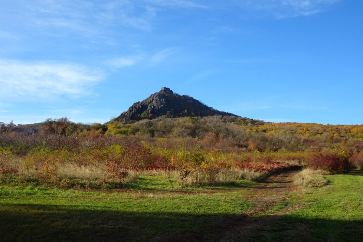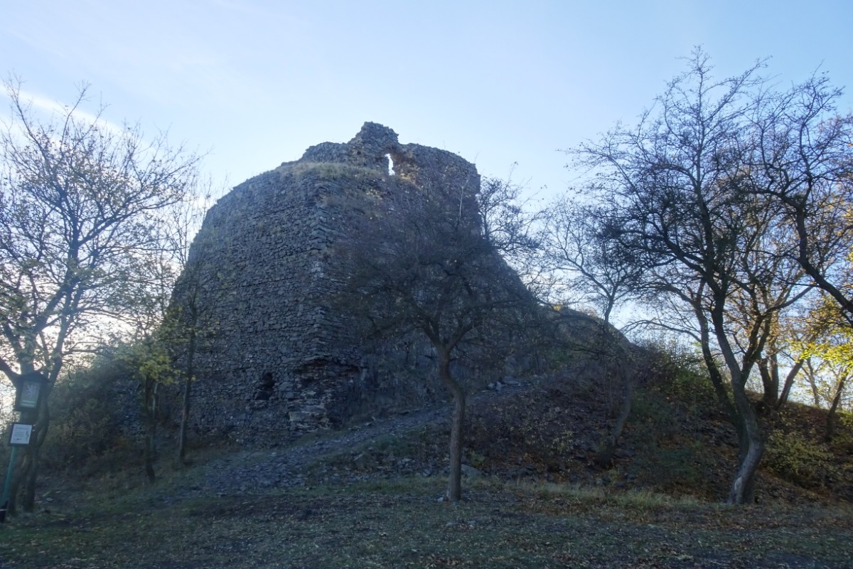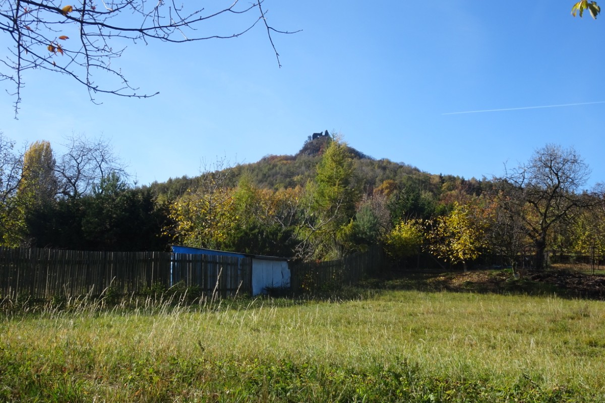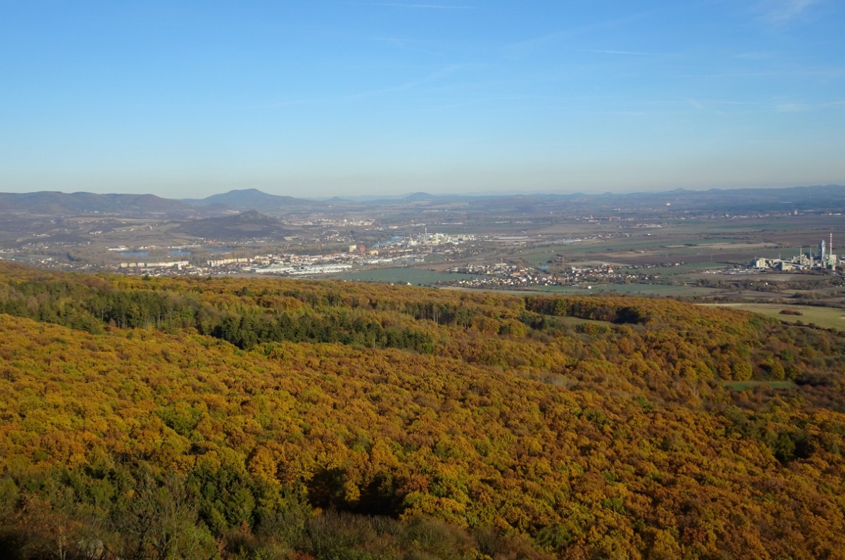 O osadě Chrastná jsem neměla ani potuchy. Zjevila se jako duch, prošla jsem ji raz dva a cesta vede dál mezi pastvinami. Slunce nad hlavou, kolem dokola kopečky, pasoucí se ovečky, co víc si přát? Obec Vlastislav leží v údolí, projdu ji a musím se pak vydat znovu do vrchu. Zvědavá jsem na zdejší zříceninu Skalka. Leč zastavilo u mě auto s jedním z turistů z Oltáříku a zve mě dovnitř. Abych se prý nemusela trmácet do vršku. Skalku tedy míjím za oknem auta, nechávám si ji na příště a řidič mě vysazuje v Sutomi. Odtud pokračuji dál lesem až k hradu Košťálov. Vrch Košťál je svým charakteristickým zubatým tvarem nepřehlédnutelnou dominantou panoramatu Českého středohoří a vystoupat na něj patří téměř k turistickým povinnostem. Plním ji ochotně a odměnou je mi opět nádherný výhled. Podobný jako z Oltáříku. A přece zase jiný. Tentokrát jsem tu úplně sama a vychutnávám si podzimně barevné moře lesů pode mnou plnými doušky. Hledím k obzoru k Řípu, kam se budu vracet.