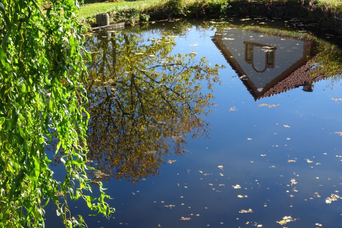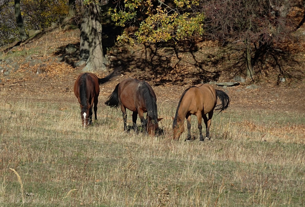 Sestupuji dolů a vracím se do Děkovky. Moje cesta dál povede po červené turistické značce. Ve vsi je kaplička a malý rybníček, v němž se krásně zrcadlí domečky. Jdu dál podle bytelné ohrady. Značku sice nějakou dobu nevidím, ale proč by tu byla, když cesta vede pořád podle ohrady? Jdu takto pěkně dlouho a najednou vidím, že se blížím k Lipské hoře. Ta dneska opravdu není v plánu! Ach jo, zase jsem zabloudila. Cestu jsem si prodloužila o takové dva kilometry. Musím se vrátit do vsi a najít tu červenou. Ta vede po silnici až na kraj vesnice a pak uhýbá úplně na druhou stranu, než jsem se vydala původně. V ohradě se zvedá kopec Plešivec. Kdo si vzpomene, že o Plešivci jsem psala nedávno (Plešivec, Kamýk a Tři kříže), bude mít pravdu. Není ale Plešivec jako Plešivec, tenhle je na jiném místě Českého středohoří. V ohromné ohradě vidím pasoucí se koně a fotím jako divá. Koně s Plešivcem. Koně s Lipskou horou. Koně s Milešovkou. Koně jen tak... Pod stromy podle cesty si sbírám jablíčka a cesta pěkně ubíhá.