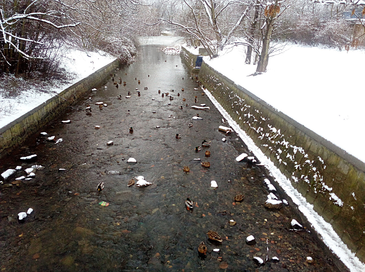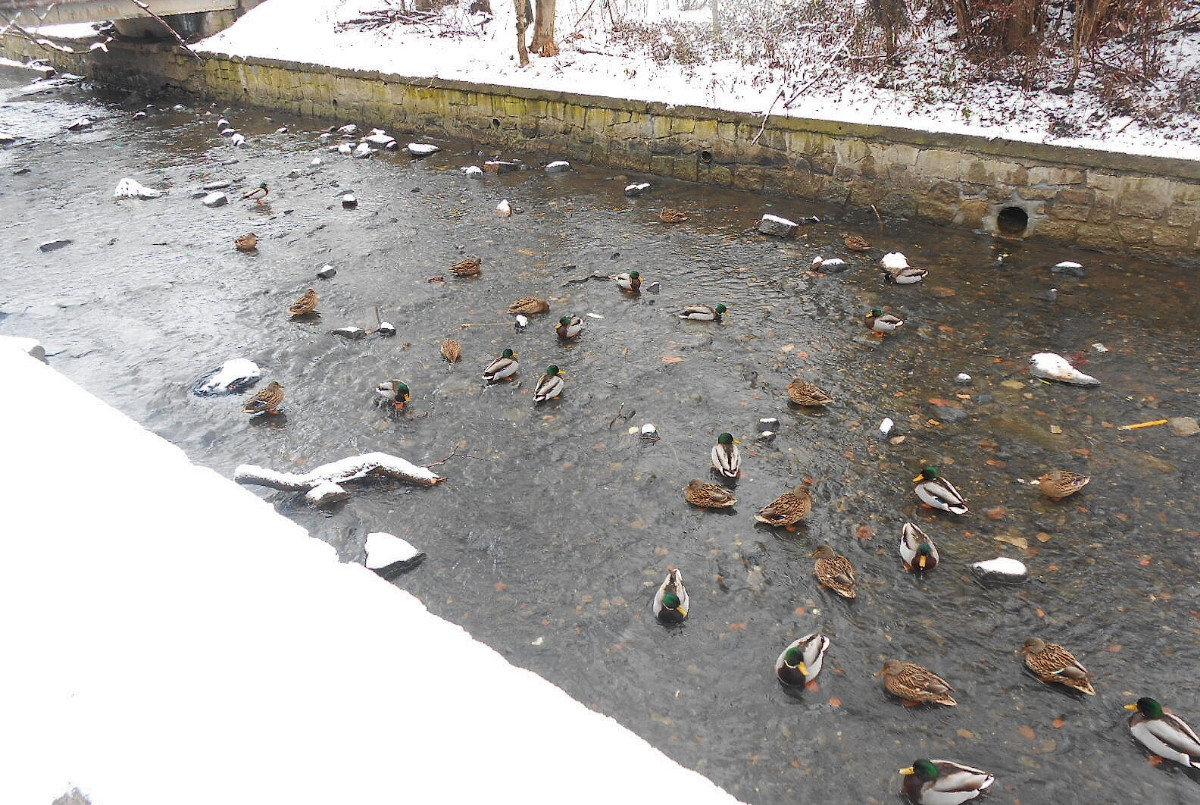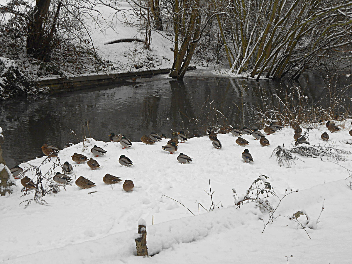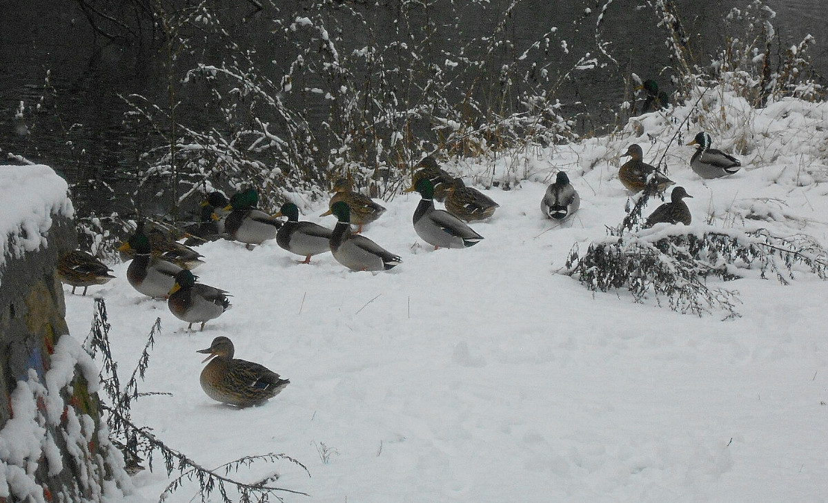 Nejdu daleko, jen tak naproti kolem rybníka, ale k tomu, abych si udělala radost, nepotřebuju nachodit kilometry. Lidé jsou zalezlí v teple domovů, sníh je neporušený a krásně bílý. U rybníka narazím na velké hejno kačenek, je ticho, takže se mohu přiblížit a nerušeně fotit. Dojdu k hrázi, voda z výpusti narušuje trochu klid kolem, pokochám se bělostí sněhu a pomalu se vracím. Kačenky jsou na stejném místě, ani se nehnou a já obdivuji jejich barvy.