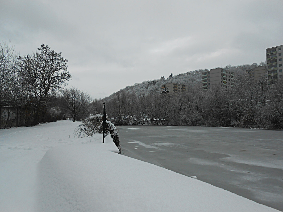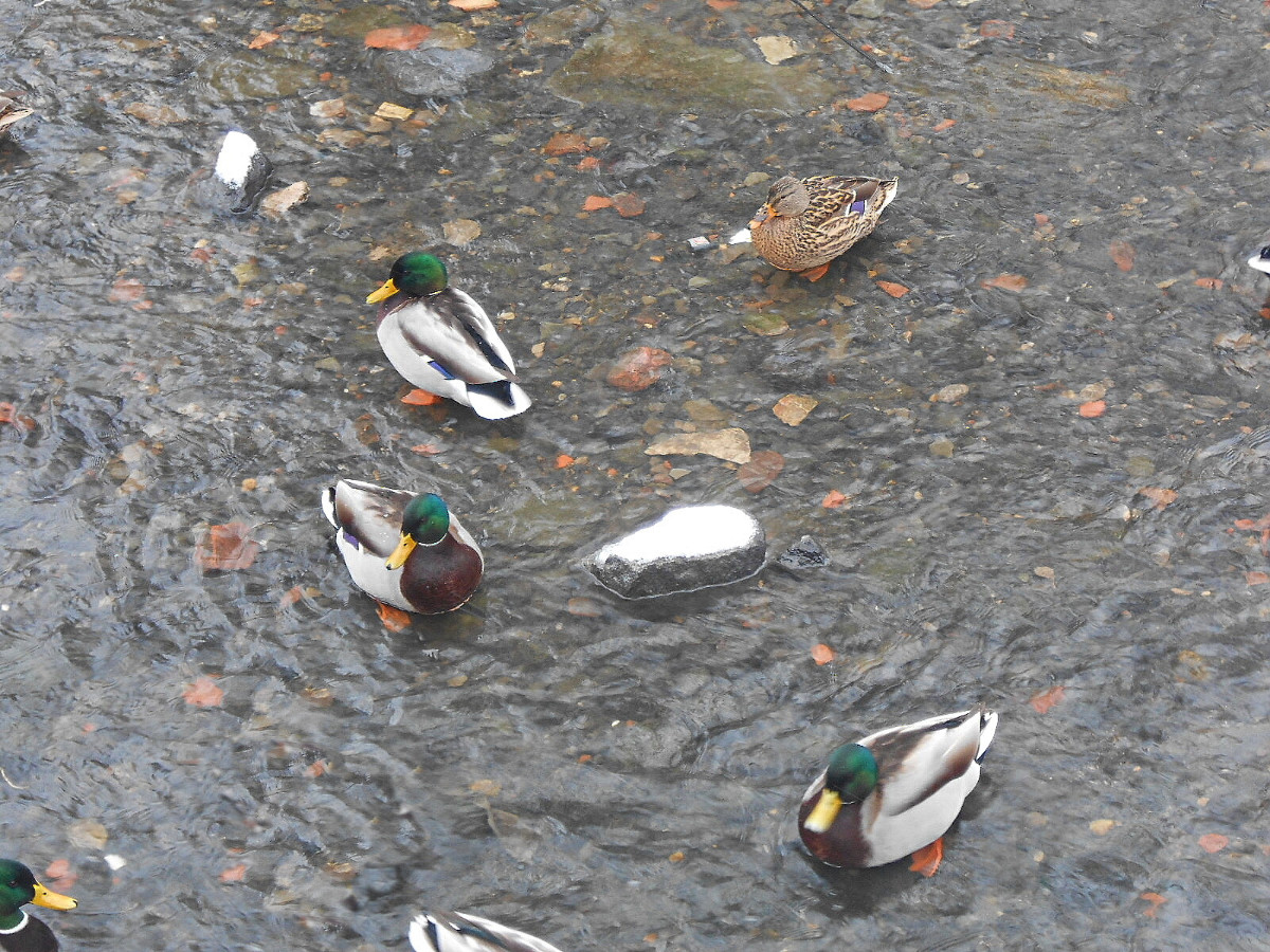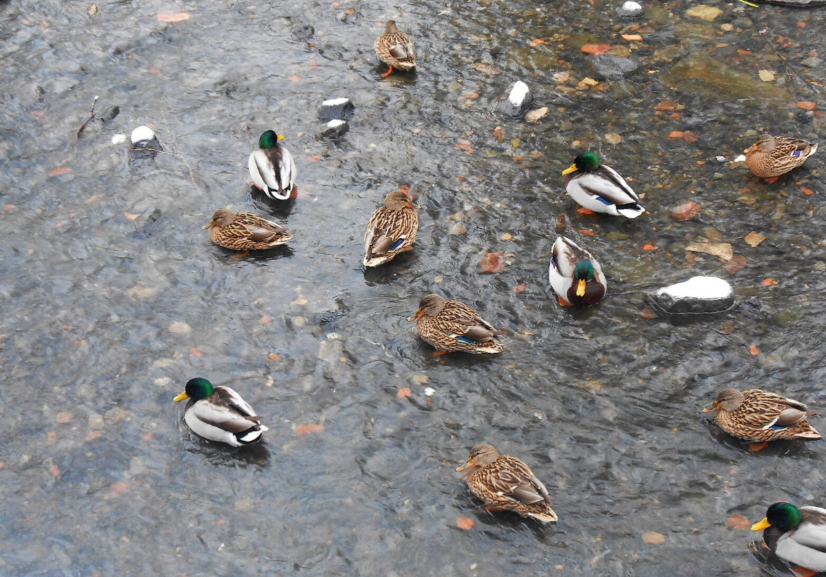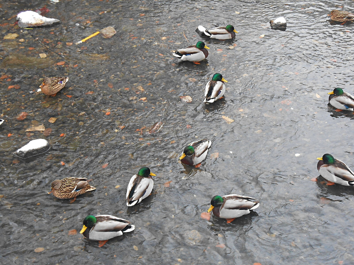 Nejdu daleko, jen tak naproti kolem rybníka, ale k tomu, abych si udělala radost, nepotřebuju nachodit kilometry. Lidé jsou zalezlí v teple domovů, sníh je neporušený a krásně bílý. U rybníka narazím na velké hejno kačenek, je ticho, takže se mohu přiblížit a nerušeně fotit. Dojdu k hrázi, voda z výpusti narušuje trochu klid kolem, pokochám se bělostí sněhu a pomalu se vracím. Kačenky jsou na stejném místě, ani se nehnou a já obdivuji jejich barvy.