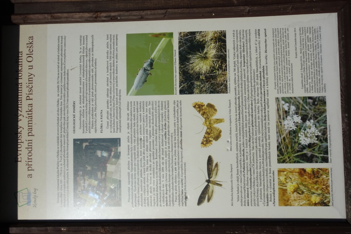 Oleško je maličká ves s necelou stovkou obyvatel a vyskytnuvší se cizí osoba je sledována. Zřejmě tímto způsobem mi místní obyvatel ochotně podal informaci, že se "trhli", mají svůj obecní úřad a snaží se o obec starat tak, aby se v ní stovce obyvatel dobře žilo. Na návsi je hezká kaplička a jeden z domů je vyzdoben pozoruhodnou freskou. Oleško je známé jako obec sousedící s bývalou vojenskou střelnicí. Ostatně střelnice v lese za vsí je stále a mě provází vytrvalé plýtvání municí, doprovázené pif paf pif paf.  Tak trochu paf jsem byla i ve chvíli, kdy z lesa, kam se chodí na houby, vyšla  trojice - pes, žena, kočka. Na mou repliku, že jde z procházky se psem a kočkou, žena opáčila, že ne. Je to totiž kocour! :) Po chvíli jsem stála před informační tabulí, z níž jsem zjistila, že činnost armády svědčila místní přírodě tak, že se tu dařilo a snad i daří mnoha druhům motýlů (přástevníku kostivalovém, lišaji pryšcovému ...) i rostlin (šater svazčitý, smil písečný, přeslička zimní ...) a byla tu vyhlášena přírodní památka Písčiny u Oleška. Paradoxně po opuštění prostoru armádou dochází k zarůstání odkrytých písčin a od roku 2006 tu už nebyl spatřen evropsky chráněný sinokvět chrpovitý. Teď však je zima, a tak si zevrubnou prohlídku chráněné lokality necháme na dobu, kdy se bude avizovanými 700 druhy motýlů jen hemžit.