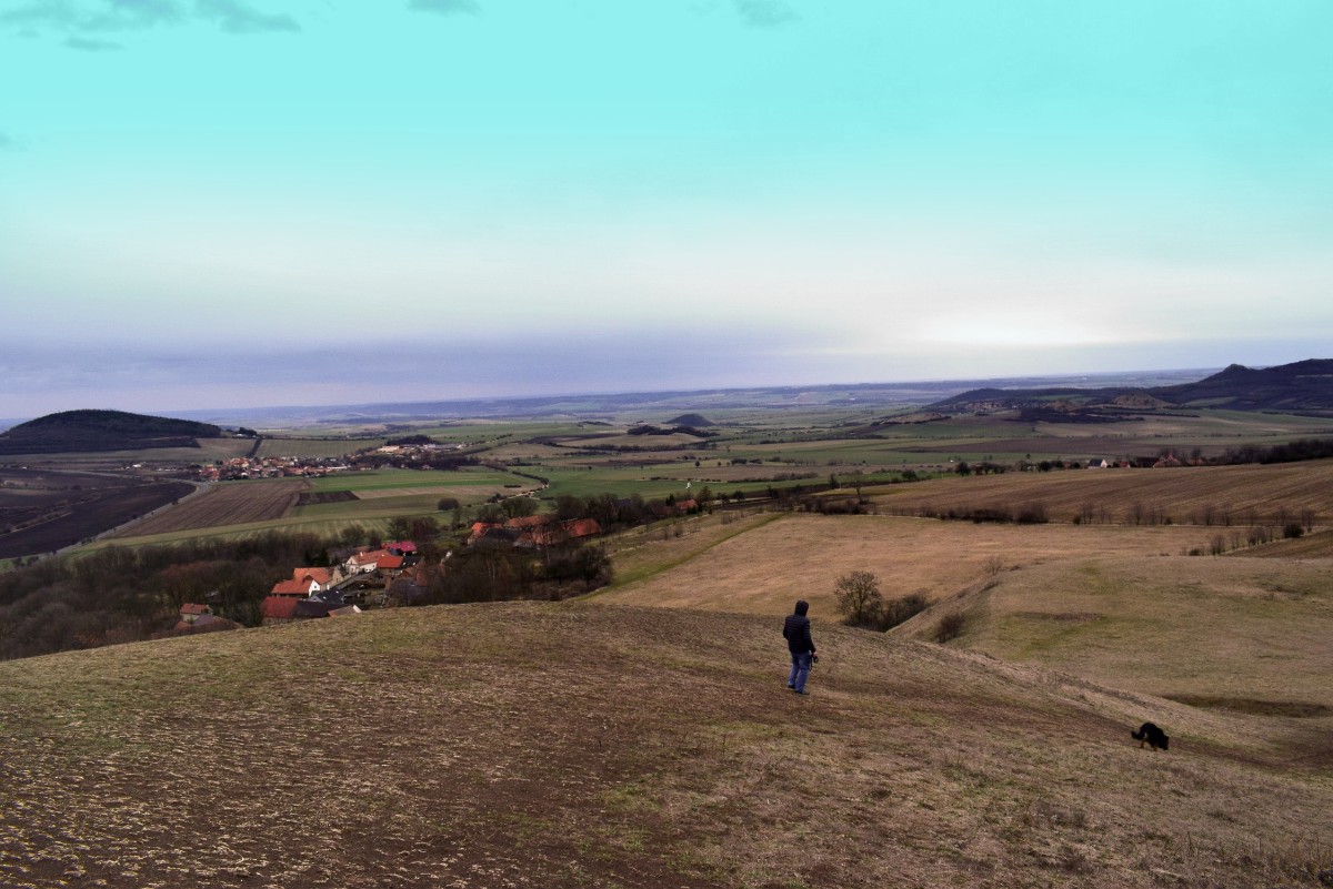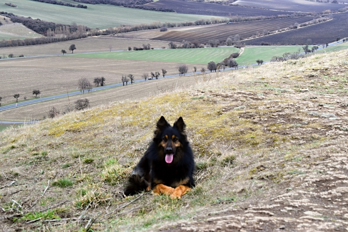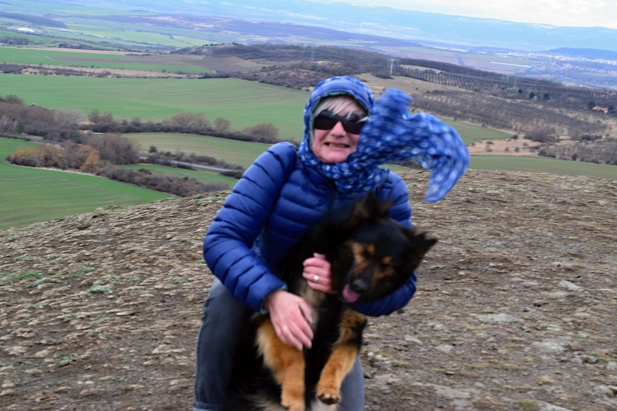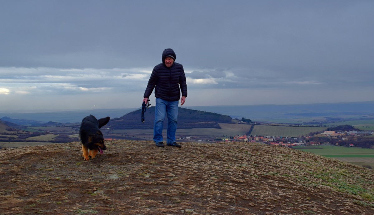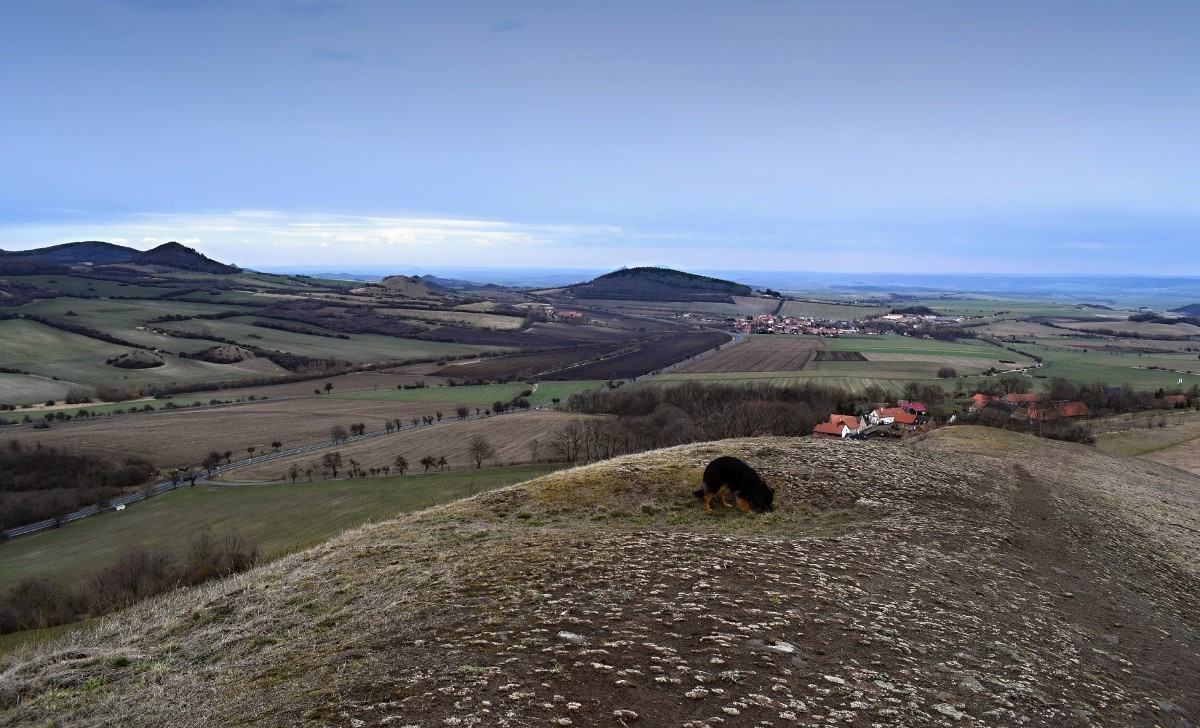 Sice nebylo slunečno, ale vítr napomohl poměrně jasnému výhledu, až ke Krušným Horám a zčásti na Bílinsko, takže i nějaké fotky vznikly. Mystinka byla šťastný pes a já šťastný člověk, v čerstvém povětří. No, není to hezký život na penzi?