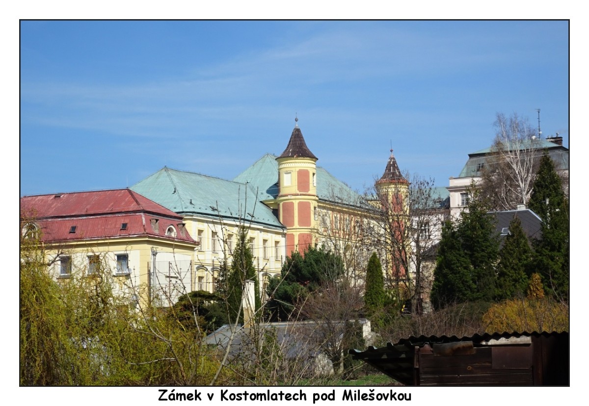 Nebyla jsem s kamarádkou sama, kdo vzal batoh a turistické boty a autobus pěkně naplnil. Většina cestujících vystoupila zrovna tam, kde my. Cílem výletu totiž byla středohorská obec Kostomlaty pod Milešovkou. V Kostomlatech mají pěkný zámek, do něhož se však nepodíváte. Pokud ovšem nejste "padlou ženou zralou pro převýchovu". Vážně, barokní zámek změnil několikrát vlastníka, až ho poslední z nich, hrabě Ledebour, v roce 1887 prodal zemskému úřadu a ten v něm zřídil ženský nápravný ústav. Podobnému účelu vlastně slouží dodnes, za vysokou zdí sídlí výchovný ústav. Na náměstíčku, kterému vedle zámku vévodí kostel sv. Vavřince, jsou vidět probíhající úpravy.