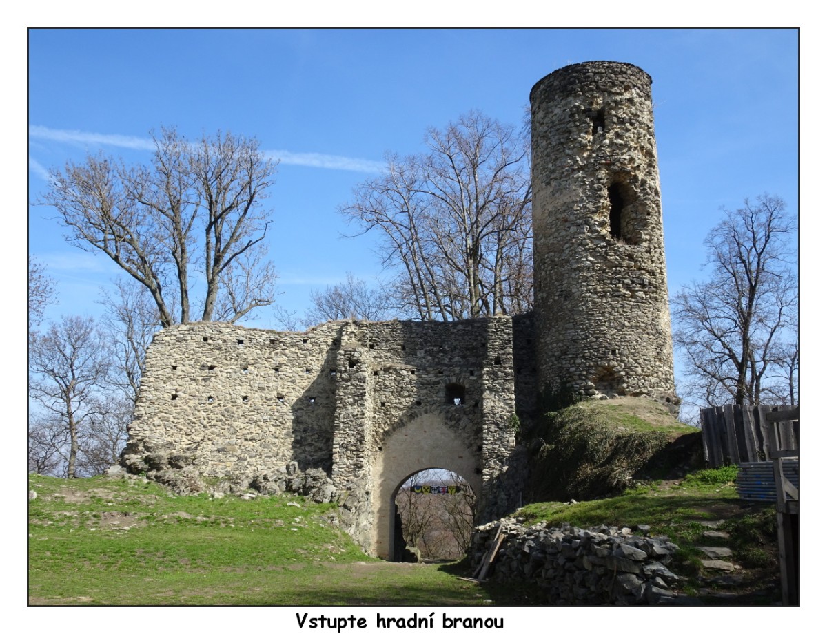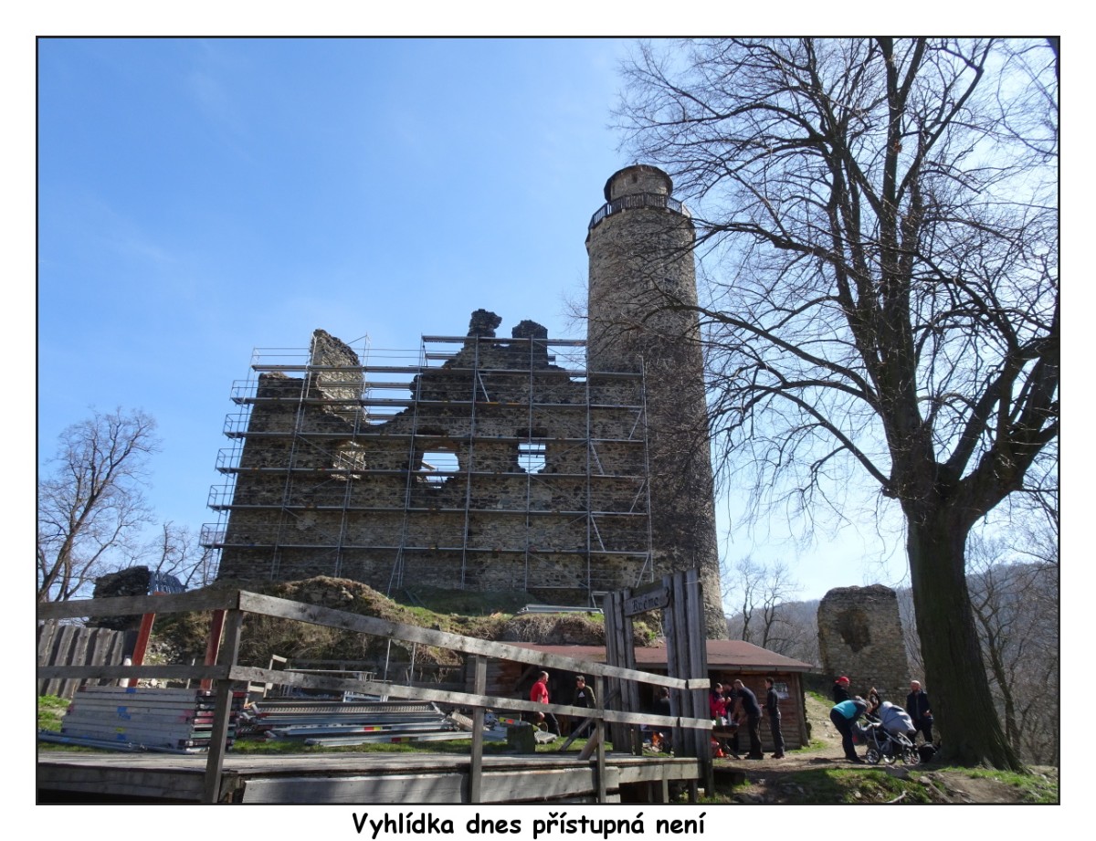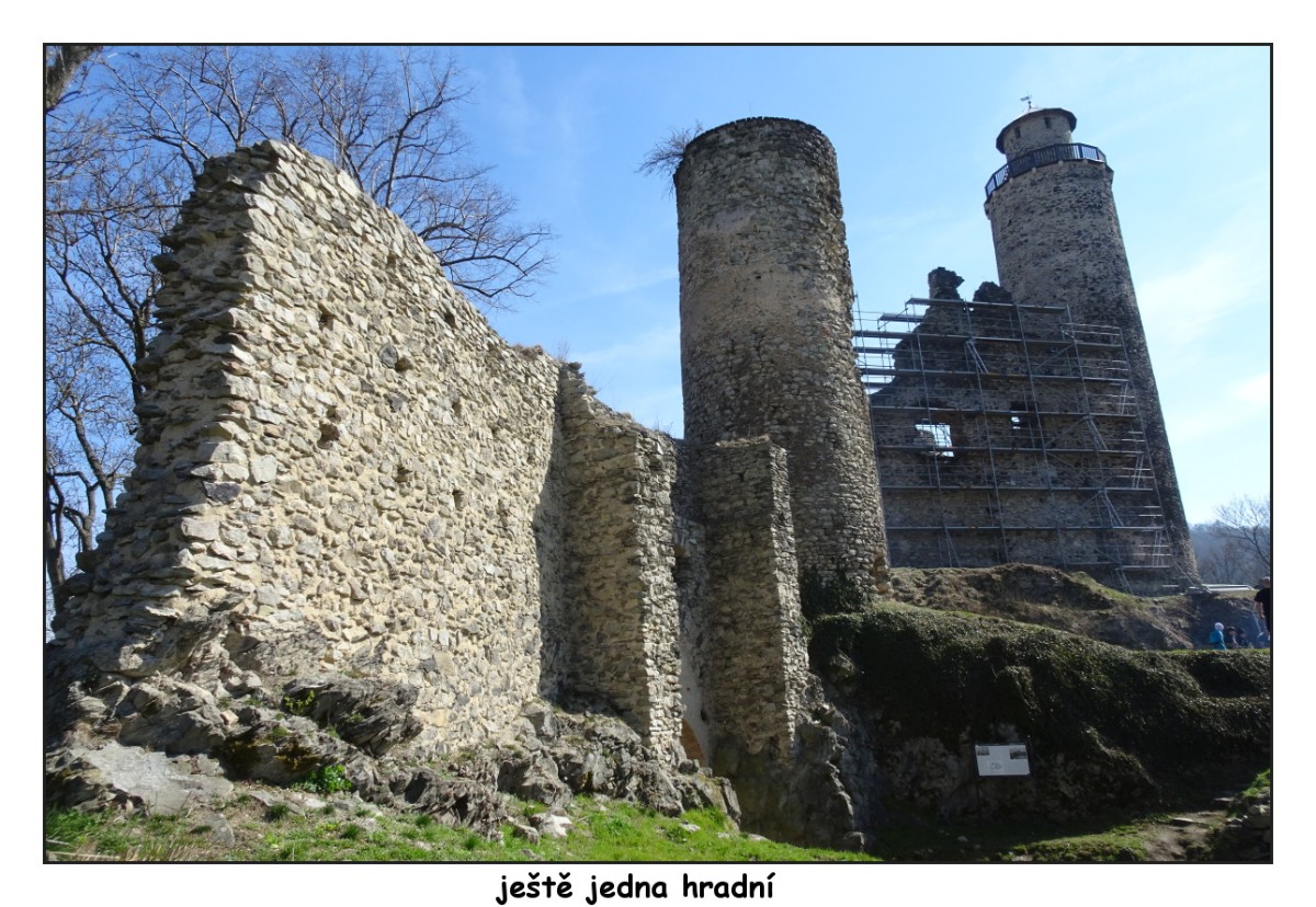 Hlavním cílem našeho výletu byla ale stavba staršího data, a sice malebná zřícenina hradu Kostomlaty, známého i pod názvem Sukoslav. Nachází se na vršku nad obcí a Kostomlaty jsou výchozím bodem turistické cesty na hrad. Tento hrad ze začátku 14. století koupil kdysi Karel IV., později patřil pánům ze Žerotína. Už od konce 16. století je opuštěný a podle toho také vypadá. Oproti stavu před asi deseti lety, kdy jsem tam byla, však doznal značných změn. Zřícenina se postupně opravuje a jedna ze dvou věží je dokonce upravena jako parádní rozhledna. Tuto sobotu jsme se nahoru bohužel nepodívaly. Zdivo kolem věže se ježí lešením a pilně se pracuje na dalších opravách. Hrad jste mohli vidět v pohádce režiséra Zdeňka Trošky Nejkrásnější hádanka.