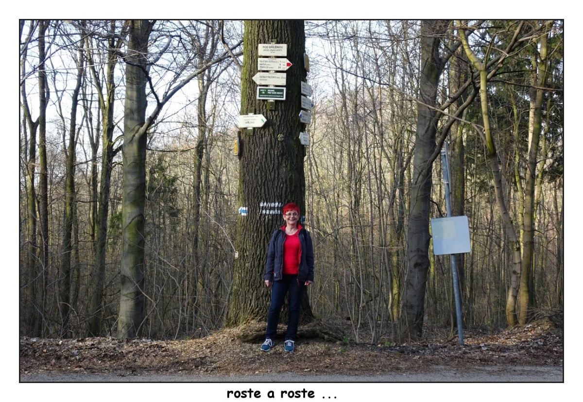 Překvapila nás kouzelná boží muka v lese téměř u silnice s autobusovou zastávkou a bonbónkem na závěr byl rozcestník na stromě v neuvěřitelné výšce. Uznejte, že jsem barevné ukazatele, na které při své výšce potřebuji pomalu dalekohled, prostě musela zdokumentovat. Jen tu Milešovku jsme tentokrát viděly jen z okénka autobusu.