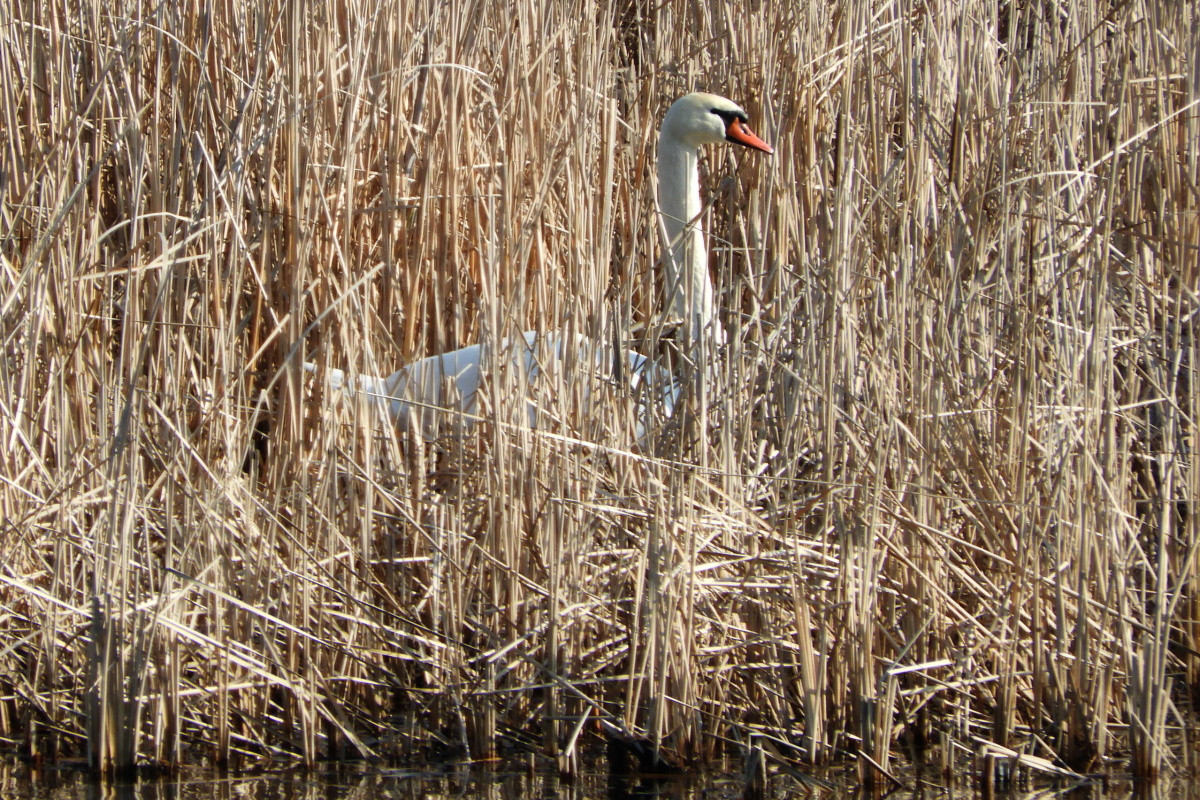 3. Počítám labutě. Třináct. Zřejmě už nějaké zahnízdily. Při obchůzce jezera objevím v rákosí dvě hnízda. Třetí labuť je zřejmě dobře ukrytá.