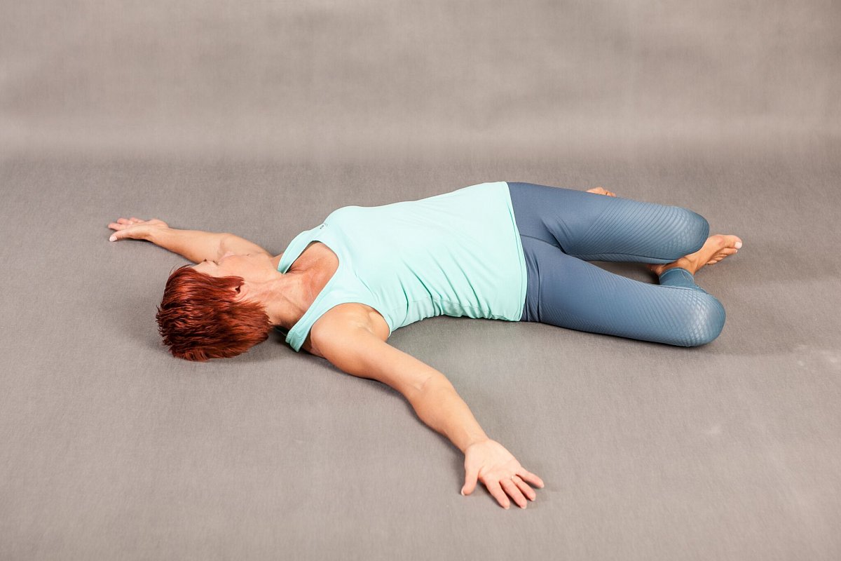 - Nejprve se klidně nadechněte a s výdechem položte nohy vpravo, hlavu otočte vlevo.