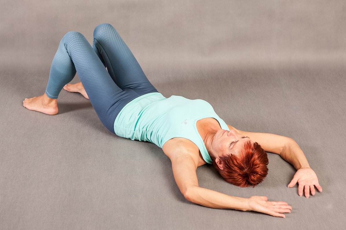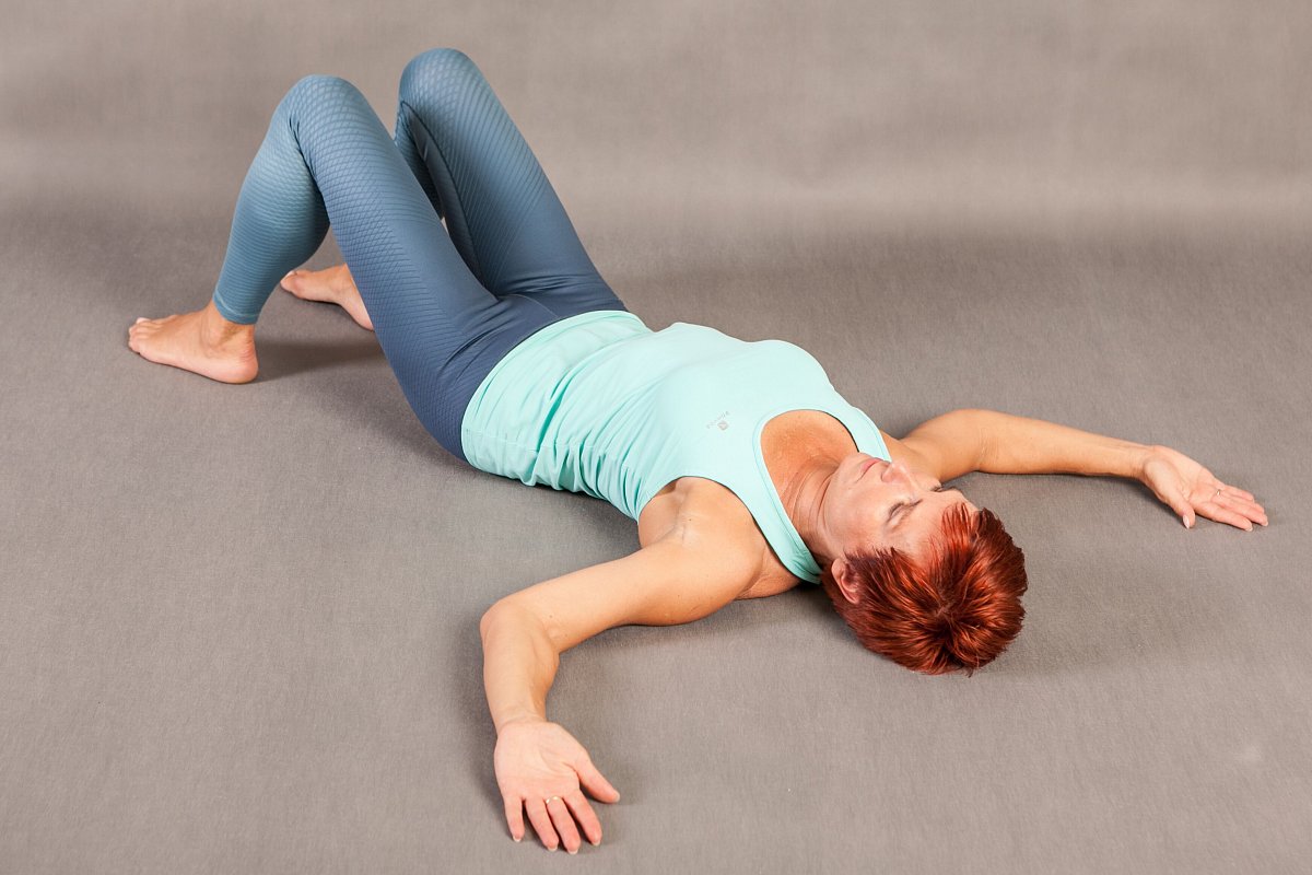 - Lehněte si na záda, pokrčené nohy na šířku pánve, v kolenou 90 stupňů, chodidla na zemi.