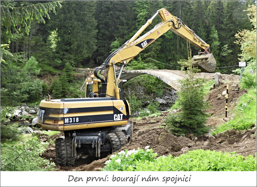Vlaky jely neuvěřitelně přesně. Na nádraží v Kořenově čekala dvoučlenná vítací delegace. Jindřiška a Karel. Přesunuli jsme se autem na ubytování. A protože vše bylo, jak má být, zbourali nám mezitím most nad Jizerou. Ale jeseničtí nejsou žádná béčka. Libovali jsme si, že budeme mít pěkné procházky. Žádný problém.