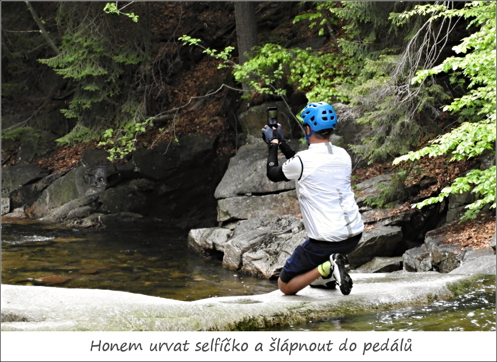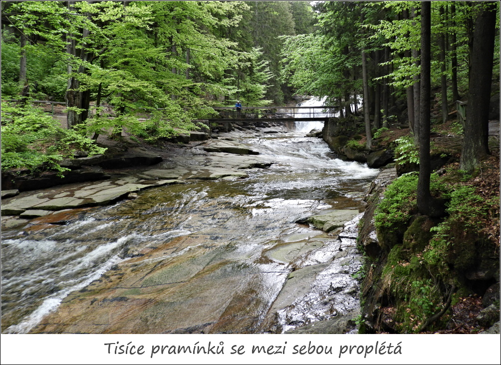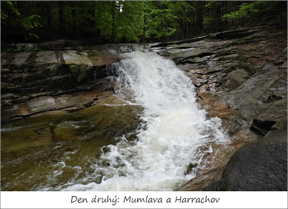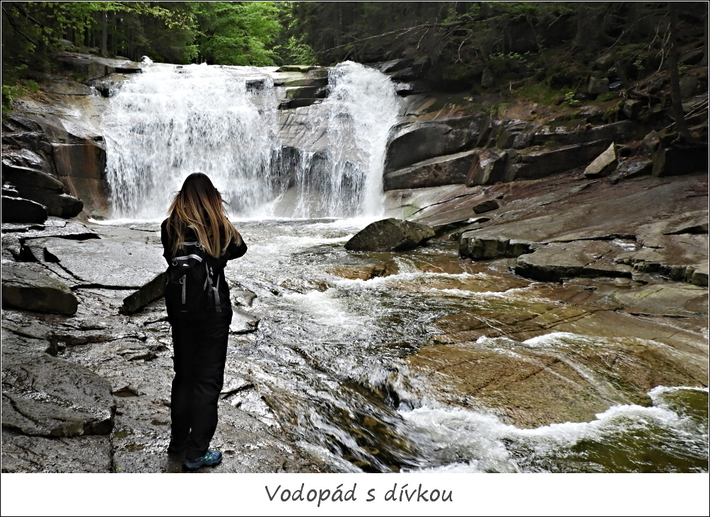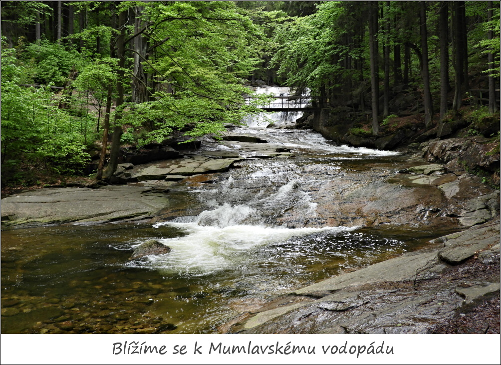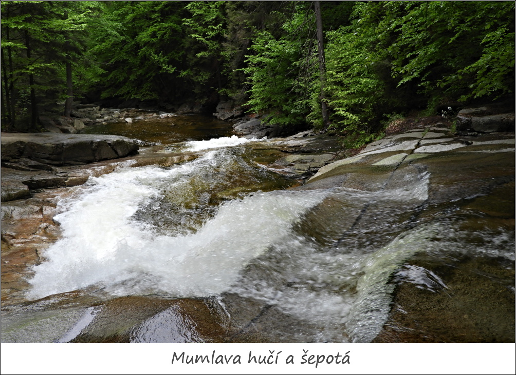 Autobus nás převezl přes kopec a už jsme šlapali kolem Mumlavy. Bylo to úžasné, byli jsme tam sami, žádné davy zvědavých turistů a ukňouraných dětiček. Vychutnávali jsme si lesní samotu a Mumlavu. Nedovedla jsem si představit, že budu poskakovat po kamenech v korytě řeky. Já přeopatrná. Užívali jsme si fotografování i když pod zataženou oblohou, chtělo to prostě DOBRÉ SVĚTLO. Při zpáteční cestě jsme již potkávali další turisty bažící po kráse vodopádu jako pes po kosti.