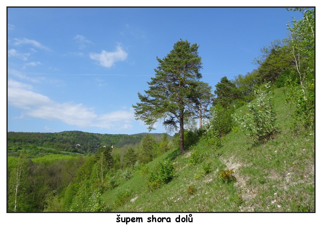 Dobře značená žlutá značka vede stále tichounkým a měkkým lesem, až se mezi stromy objeví střechy chatek a přes plot na mě hledí houf dětí. Dnes tu je skautské středisko, ale před lety tu byly moje děti na ozdravném táboře. V podstatě jsem jen přešla silnici a znovu mizím v zeleném ráji. Na rozcestí přestupuji na červenou a záhy se objevuje Skalice. Skalice je obec pod Dlouhým vrchem a sama o sobě je východiskem pro další vycházku, však já se tam vrátím. Někdy jindy. Dneska mám před sebou Bílou stráň, známou přírodní rezervaci u Litoměřic. Její název je vskutku příhodný, protože svítí do dálky bílým opukovým podložím, na němž se daří teplomilným rostlinám, najmě několika druhům vstavačovitých - českých orchidejí. Zatím jsem tu však našla jen vstavače nachové. Budu sem muset ještě jednou. Stráň je hodně strmá a pohyb po ní není úplně snadný, dobré boty jsou žádoucí. Na tabuli se píše, že rezervace tu byla vyhlášena v roce 1954, to jsou věci - je tedy tak stará, ehm mladá jako já.