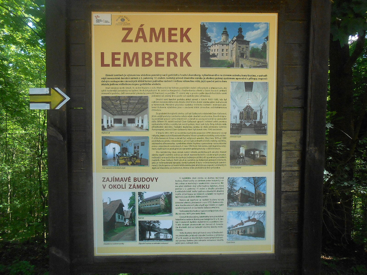 Zámek Lemberk se nachází v obci Lvová u Jablonného v Podještědí. Jeho předchůdcem byl středověký hrad, založený asi ve 40. letech 13. století, jako pomezní pevnost na obchodní stezce z Čech do Žitavy.  Nejznámější z držitelů  byl Havel z rodu Markvarticů, jehož manželkou byla Zdislava, která se díky své péči o poddané a hlavně nemocné a svými léčitelskými schopnostmi zapsala do dějin jako Svatá Zdislava. Známá je Zdislavina studánka, vodou z pramene této studánky léčila nemocné, slepé a chromé lidi. Zřejmě to byl také důvod, že zemřela patrně na nákazu TBC ve věku necelých 35 let. Její hrobku lze najít v chrámu sv. Vavřince a sv. Zdislavy v Jablonném. Za svatou byla prohlášena v roce 1995. Je patronkou Libereckého kraje. Z hradu Lemberk vznikl přestavbou v 16. století renesanční zámek. V současnosti je jako státní zámek ve správě NPÚ. Je přístupný veřejnost od dubna do října a myslím, že je opravdu na co se dívat. Veškeré podrobnější informace jsou dostupné na wikipedii.