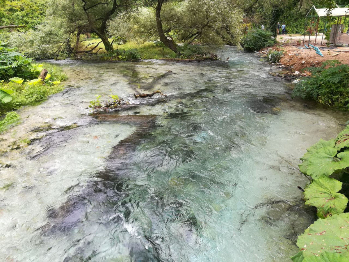 Místo zvané Modré oko je prameniště významné říčky Bystrici. Je to velká zásobárna výborné vody – takže, jak to bývá, zmerčil to jakýsi podnikatel a pokusil se tam vodu lahvovat a vyvážet do Itálie. Naštěstí zkrachoval. Samotné Modré oko je vodní propast, odkud zespodu vyvěrá mocný proud studené vody fotky G1a, b). Kdykoliv se pokusili hloubku propasti změřit, vždy jim v hloubce 45 metrů silný proud měřicí sondu vytlačil. Proto se neví, jak je to celé hluboké. Jak to bývá, místo je to nádherné, bohužel docela zanedbané až zpustlé. Všechno neupravené a pití nebo nanuk pro turisty dražší než u nás. Zcela nedostatečná turistická infrastruktura je velkým nedostatkem, ačkoliv to zatím zdánlivě nevadí, protože to jsou místa, která cizince pořád lákají.