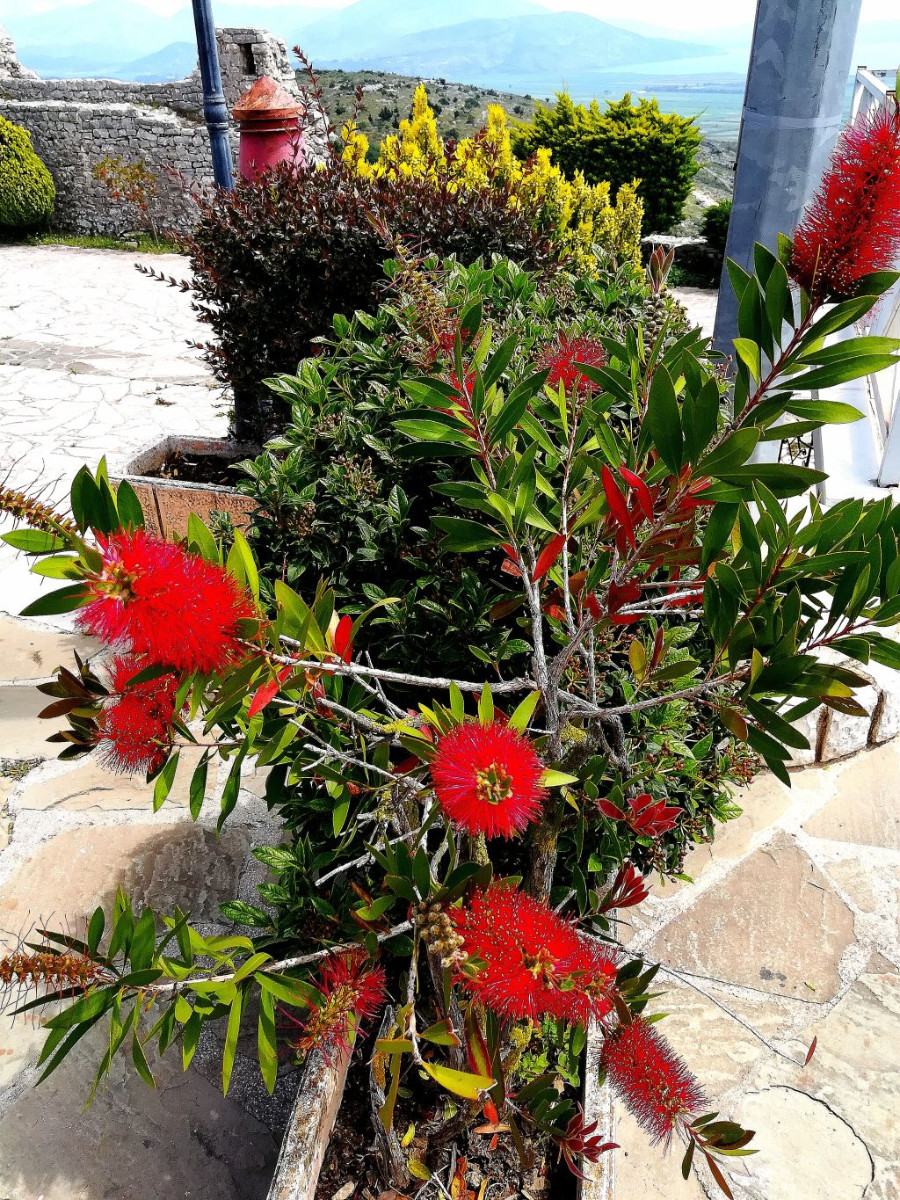 Přímo nad Sarandou se tyčí vrchol s hradem Lekuresi a panoramatickým výhledem do širokého okolí. Zaujala mne rostlina, kterou jsem neznal. Musel jsem se zeptat a dozvěděl se, že to je „kartáč na lahve“. Tak to posílám dál (fotka G2) a schválně, kdo zná český název (já už ano). Odtud je také fotografie s jedním z nesčetných bunkrů. Zajímalo by mne, zda měl Hodža tolik palných zbraní, kolik měl bunkrů. Ono totiž házet okénkem ven kamení mi nepřišlo jako příliš účinné pro případ, že by k pobřeží připluly křižníky a vyloďovací plavidla Italů, kteří by chtěli obyvatelstvu zvýšit životní úroveň.