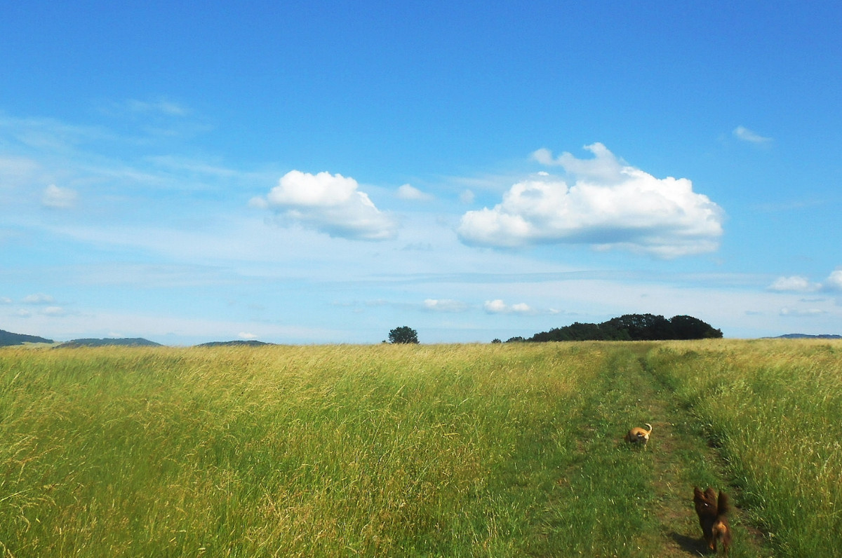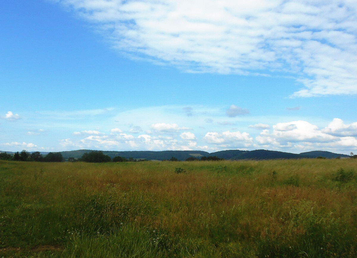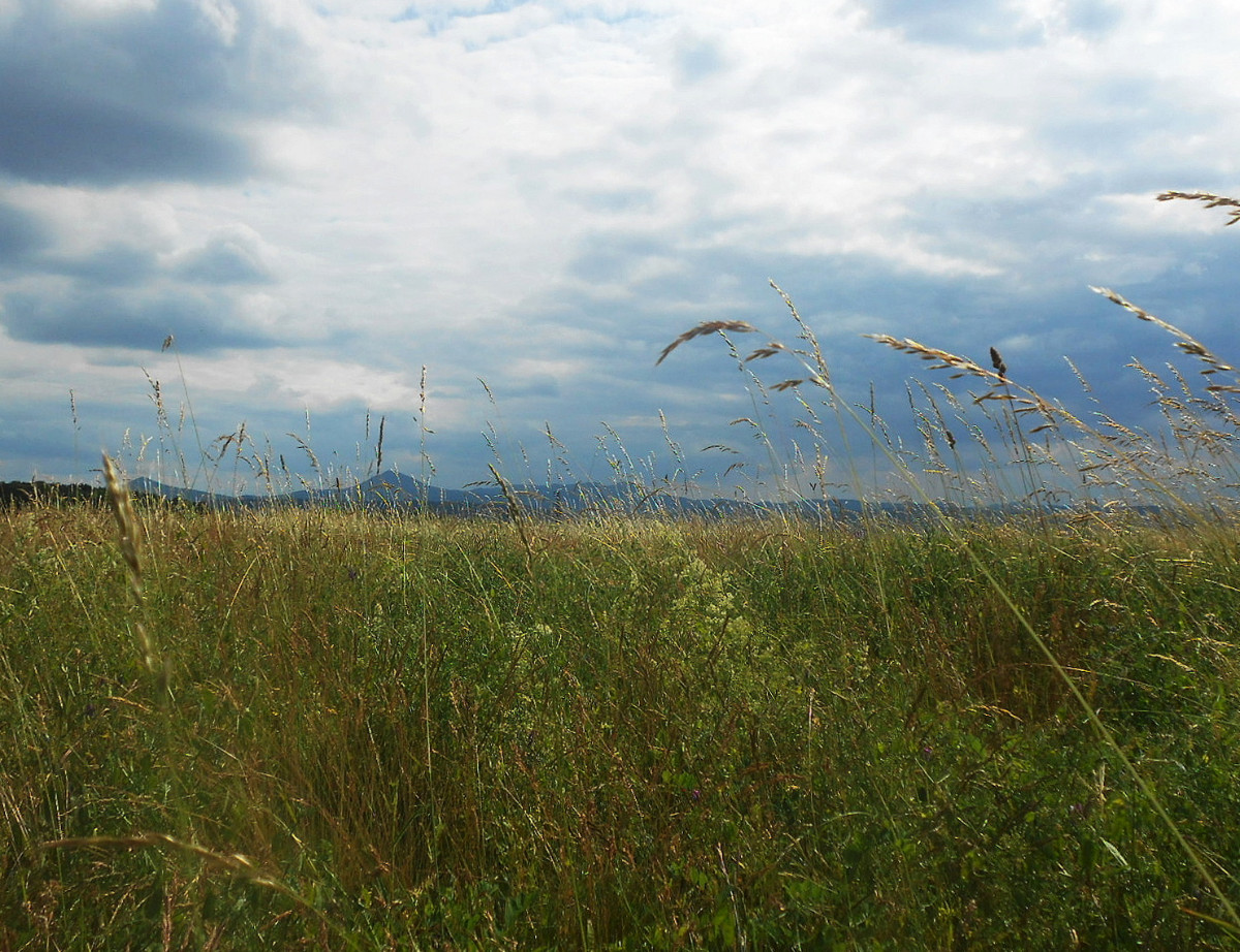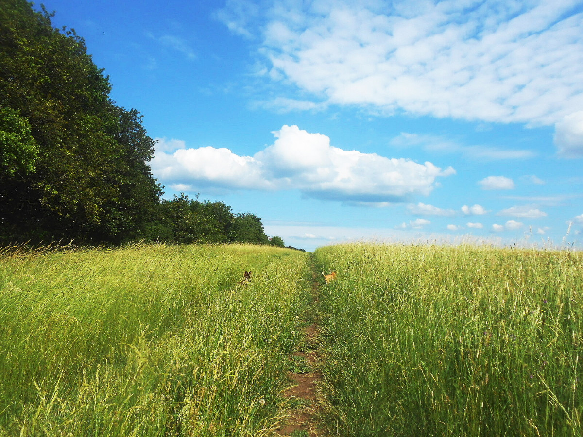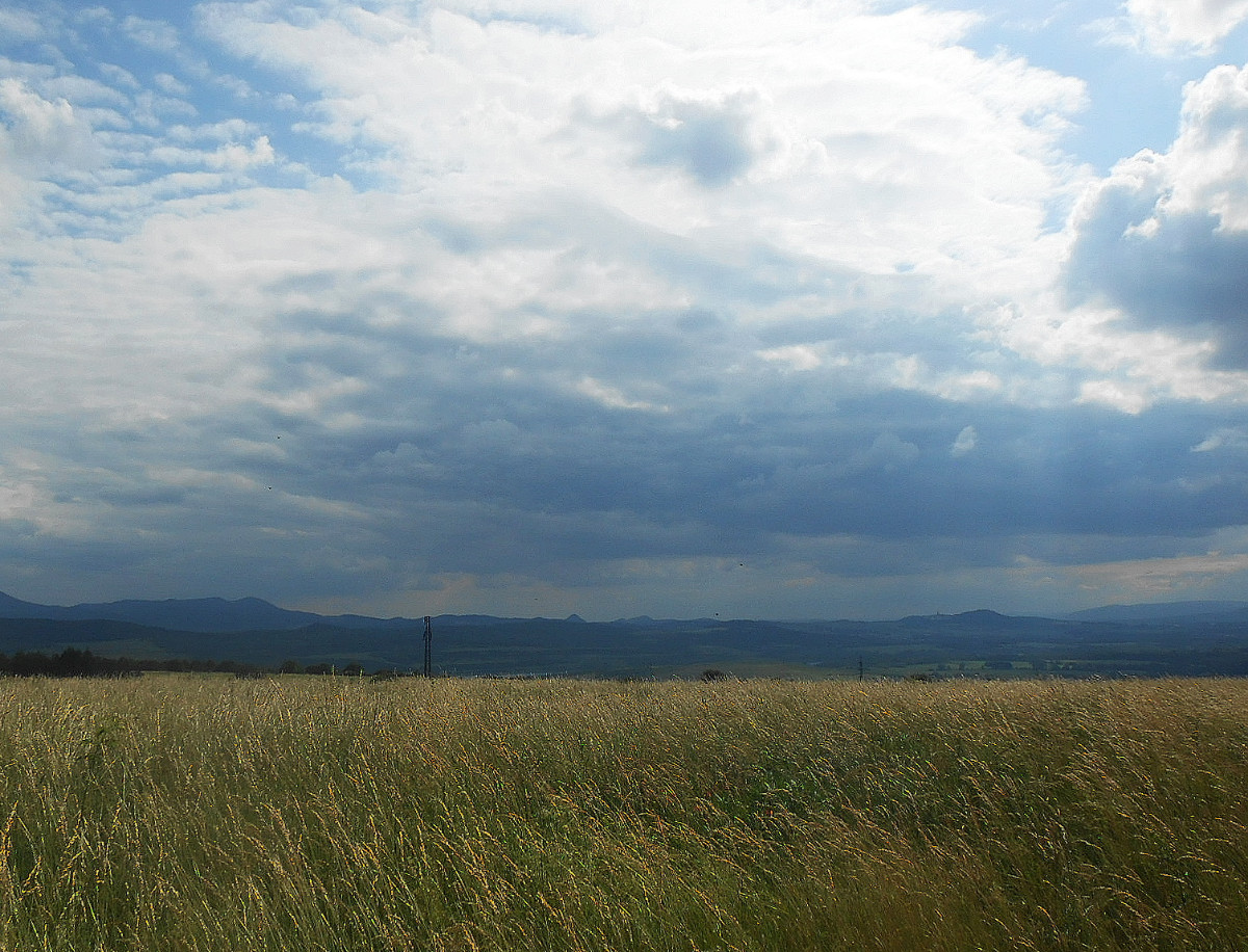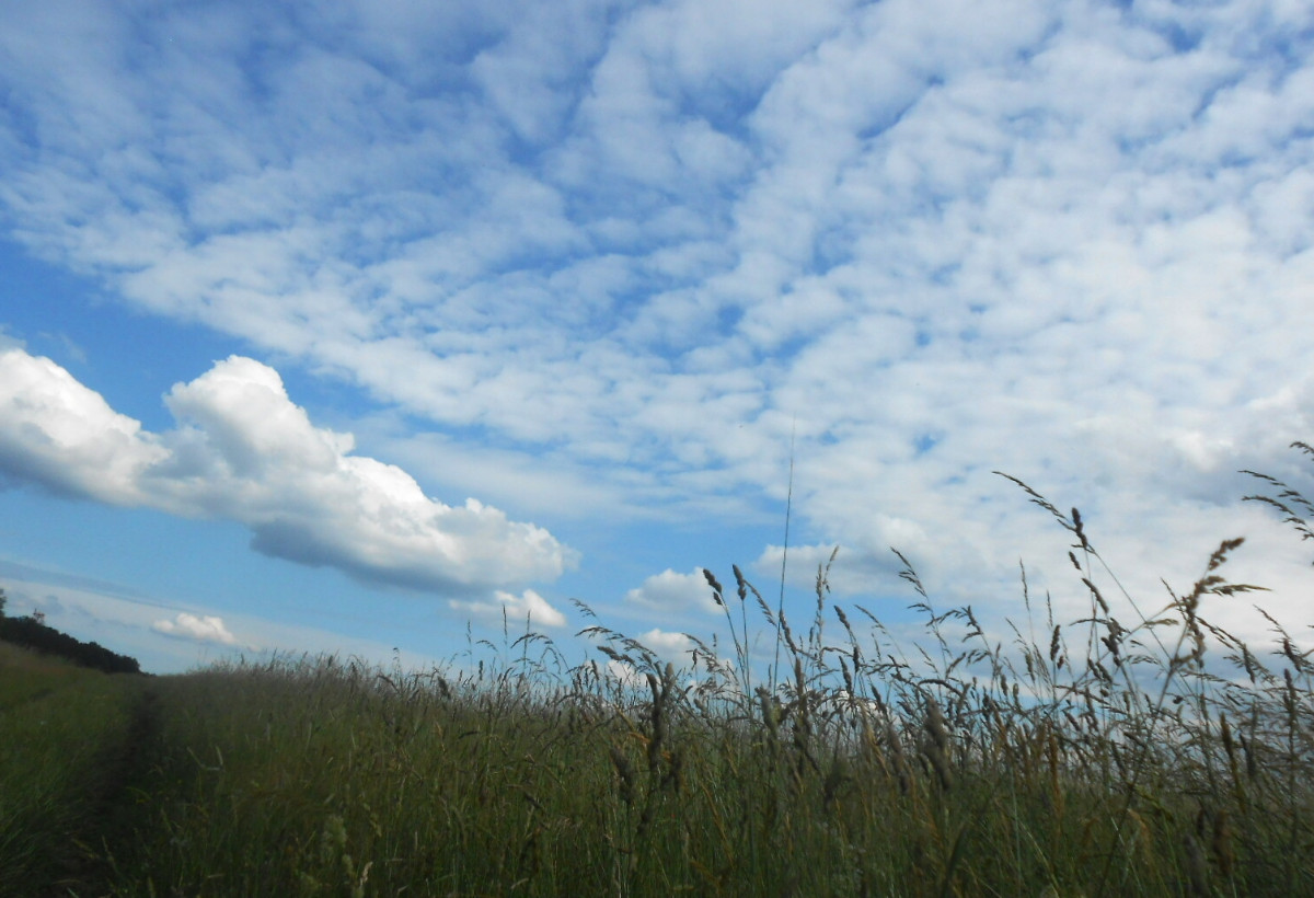 Za těch pár týdnů totiž tráva vyrostla tak, že psi v ní nebyli vidět, ale zato barevně byla pestřejší. Nebe nechtělo zůstat pozadu a mraky se také docela předvedly, takže občas jsem šla do kolen a snažila se to spojit. Kvítího tam moc nebylo, ale něco se přece jen vyskytlo, zato hmyz přede mnou prchal jak o závod. Takže kytičky, travička a mráčky ano, broučci a motýlci ani náhodou.