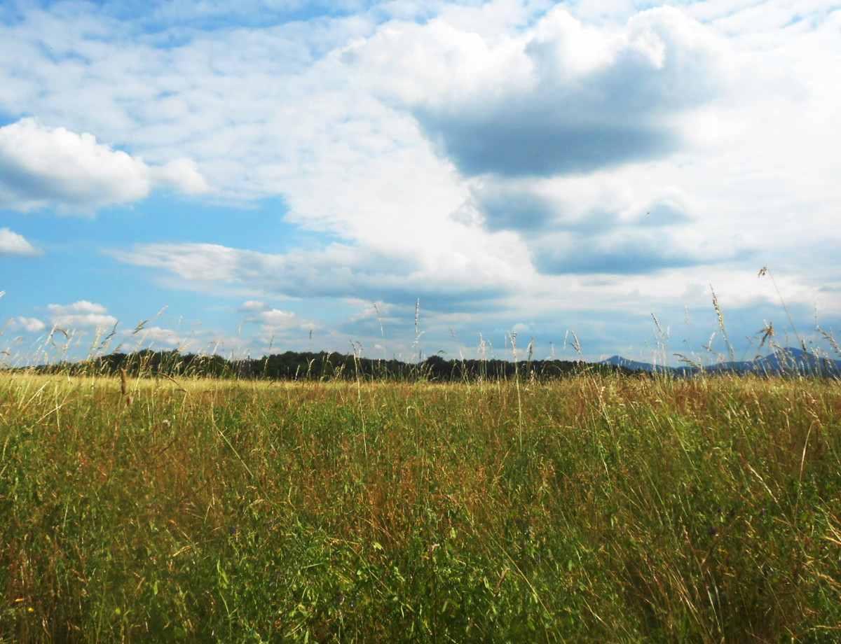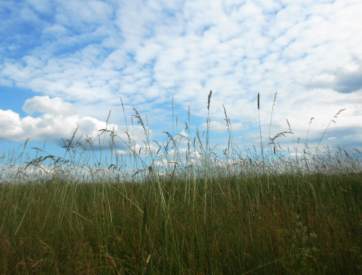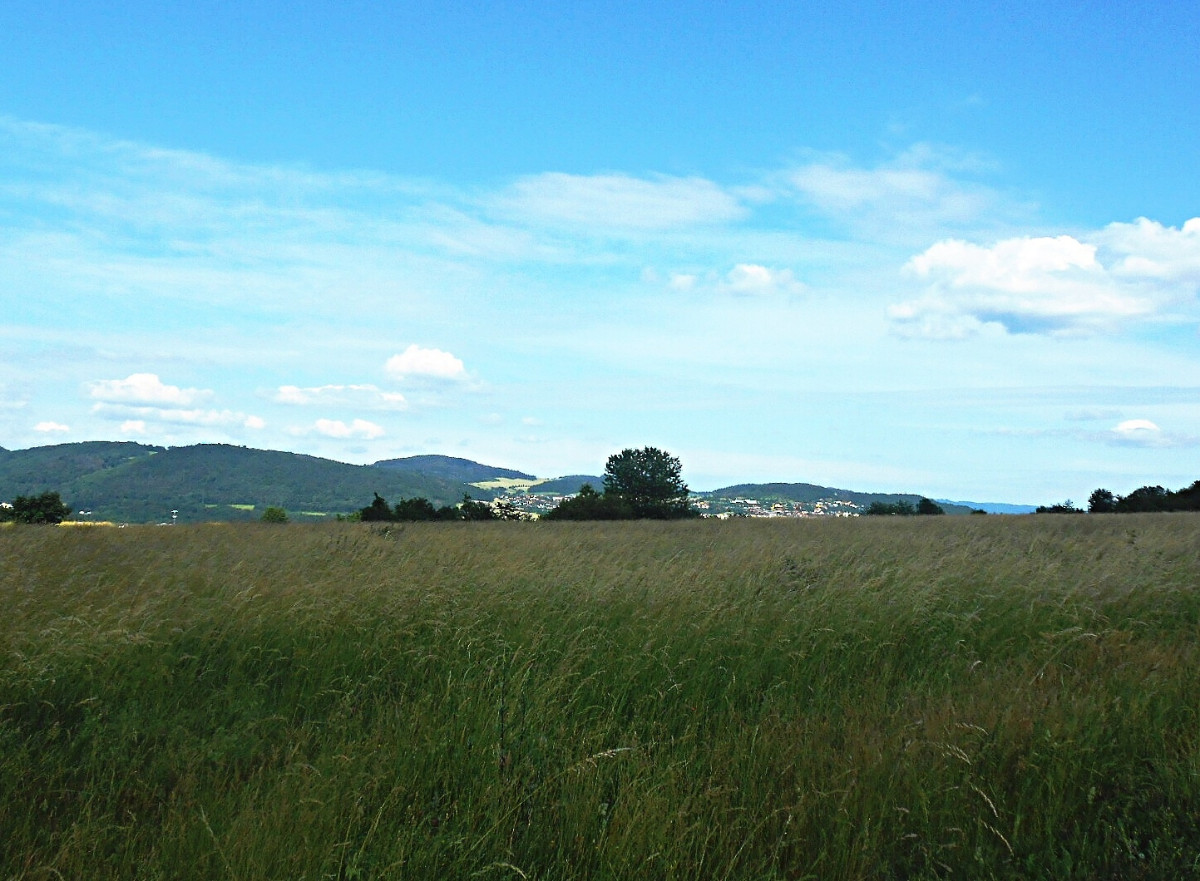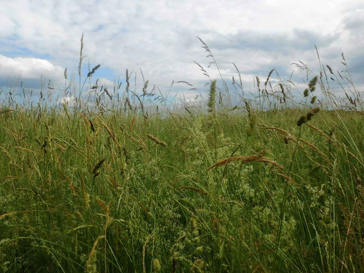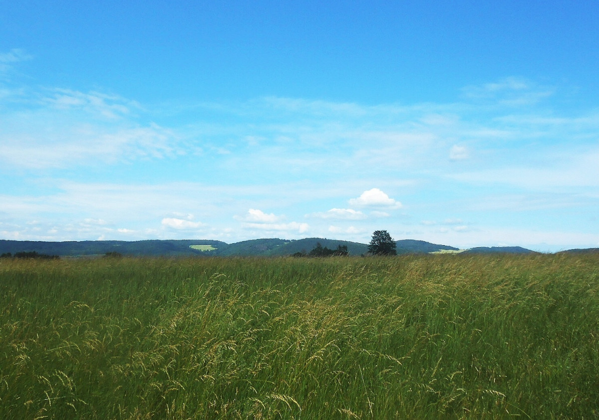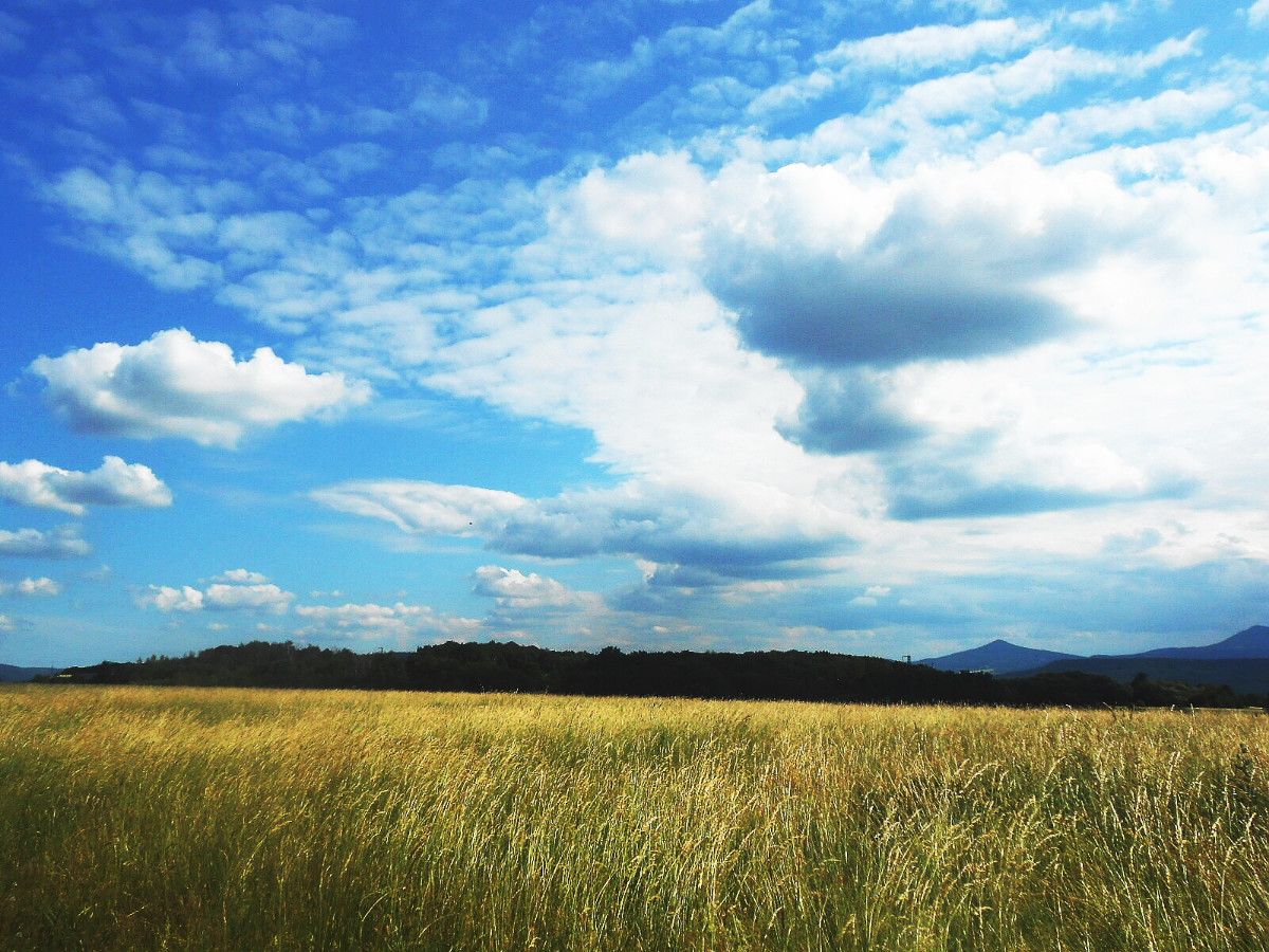 Za těch pár týdnů totiž tráva vyrostla tak, že psi v ní nebyli vidět, ale zato barevně byla pestřejší. Nebe nechtělo zůstat pozadu a mraky se také docela předvedly, takže občas jsem šla do kolen a snažila se to spojit. Kvítího tam moc nebylo, ale něco se přece jen vyskytlo, zato hmyz přede mnou prchal jak o závod. Takže kytičky, travička a mráčky ano, broučci a motýlci ani náhodou.