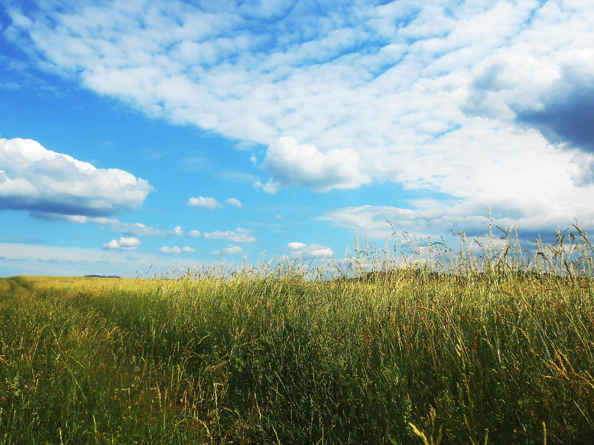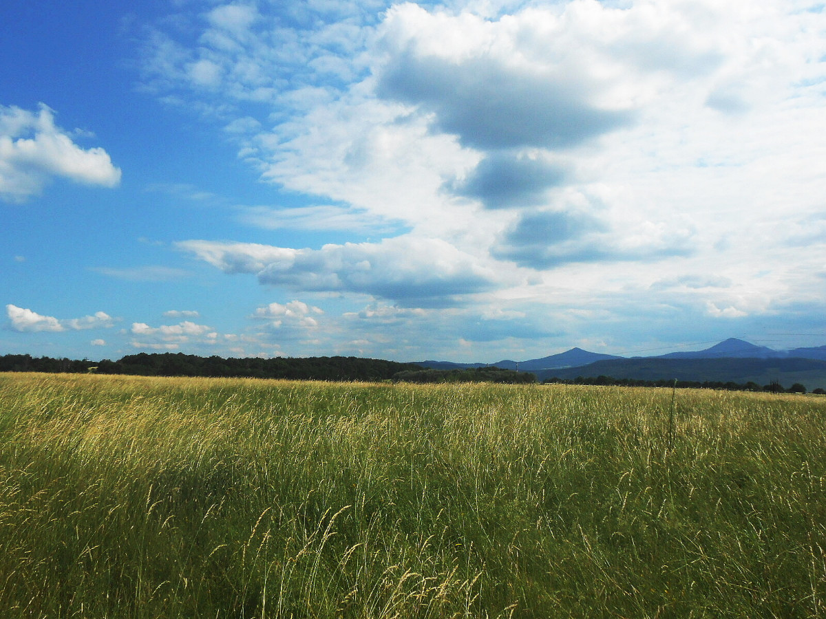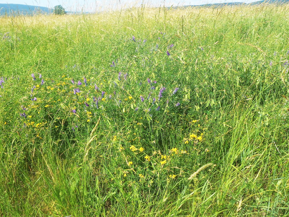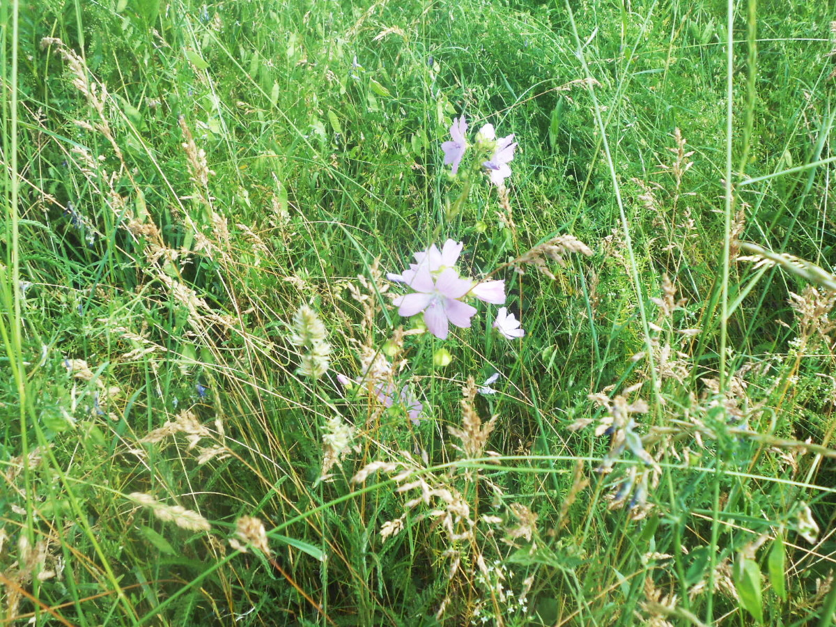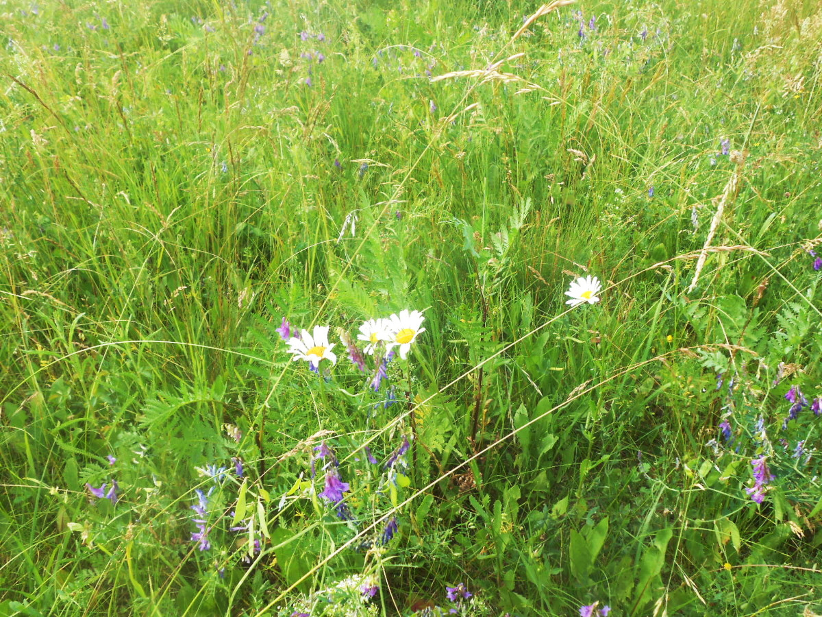 Za těch pár týdnů totiž tráva vyrostla tak, že psi v ní nebyli vidět, ale zato barevně byla pestřejší. Nebe nechtělo zůstat pozadu a mraky se také docela předvedly, takže občas jsem šla do kolen a snažila se to spojit. Kvítího tam moc nebylo, ale něco se přece jen vyskytlo, zato hmyz přede mnou prchal jak o závod. Takže kytičky, travička a mráčky ano, broučci a motýlci ani náhodou.