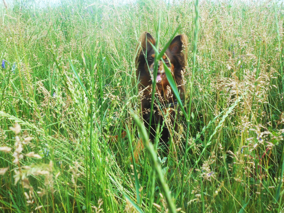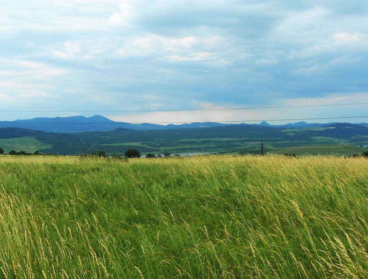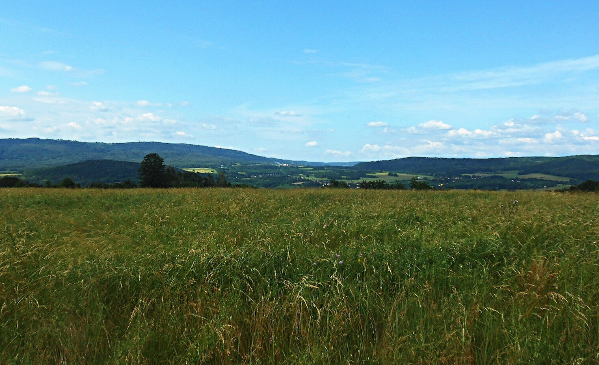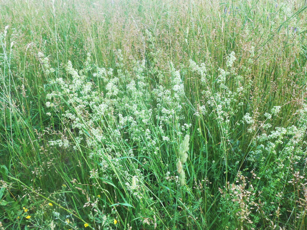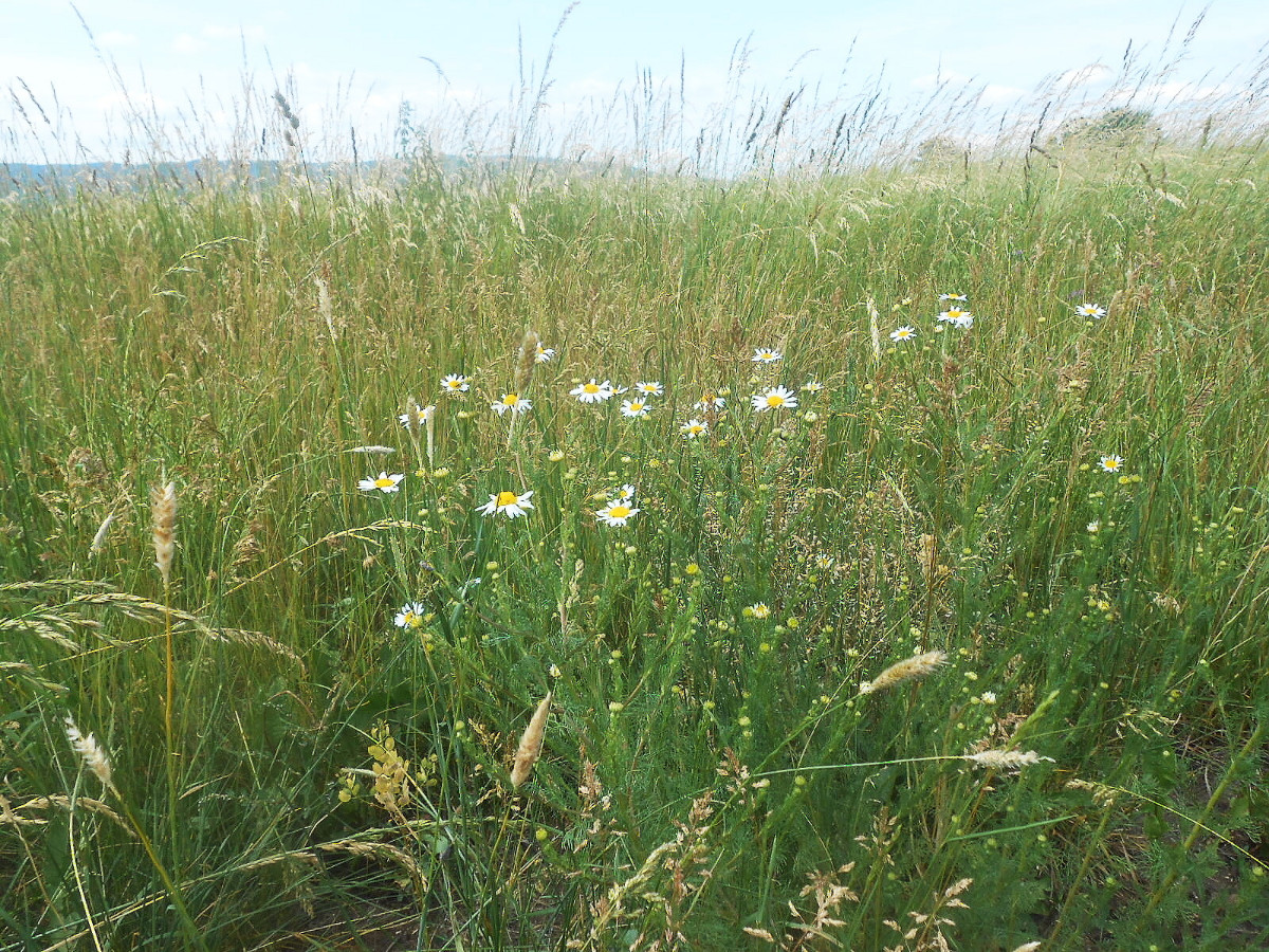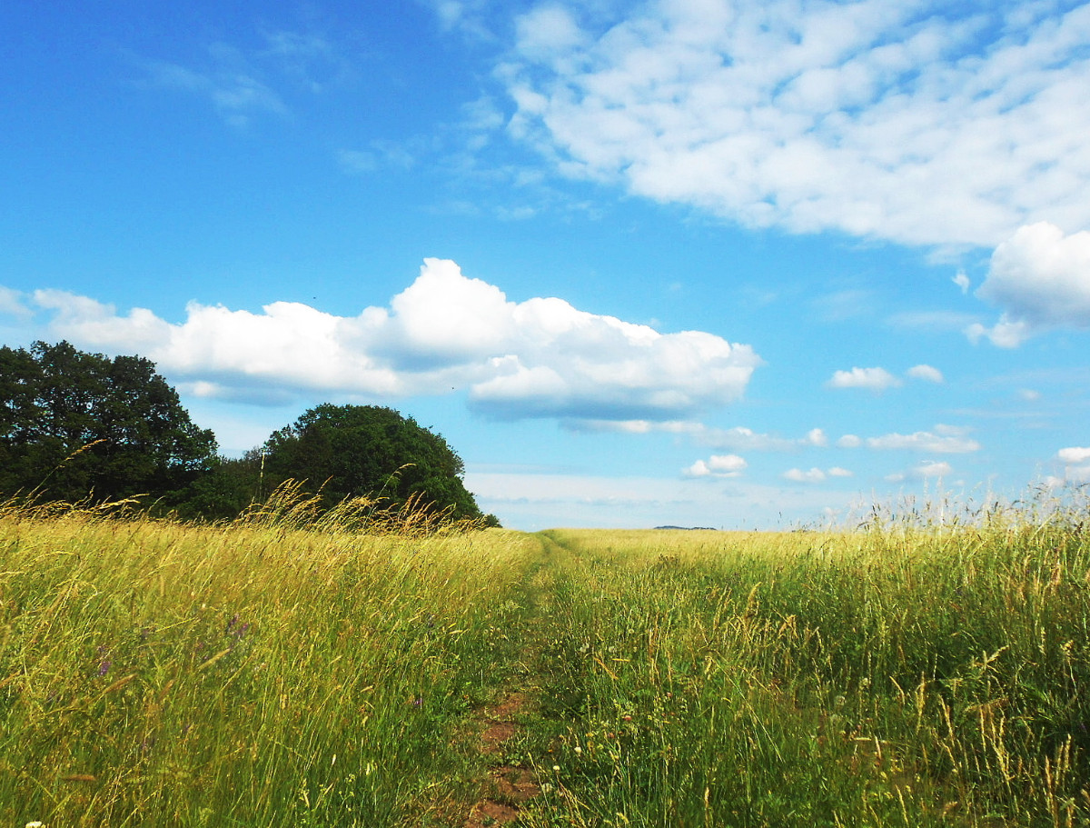 Za těch pár týdnů totiž tráva vyrostla tak, že psi v ní nebyli vidět, ale zato barevně byla pestřejší. Nebe nechtělo zůstat pozadu a mraky se také docela předvedly, takže občas jsem šla do kolen a snažila se to spojit. Kvítího tam moc nebylo, ale něco se přece jen vyskytlo, zato hmyz přede mnou prchal jak o závod. Takže kytičky, travička a mráčky ano, broučci a motýlci ani náhodou.