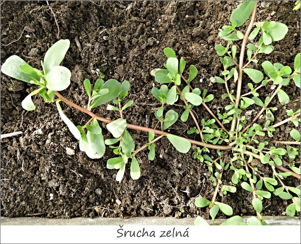 Netradičně zařadím do tohoto povídání krátký odstavec o plevelu, který snad roste na každé zahrádce a jenž obyčejně končí nevšímavě na kompostu. Asi již tušíte, alespoň někteří, že se jedná o bylinu, která má zvláštní jméno: šrucha zelná (portulák), jenž mi bujně roste ve skleníku i na záhonech. Jménem to však nekončí, je velice zajímavá. Posuďte sami: