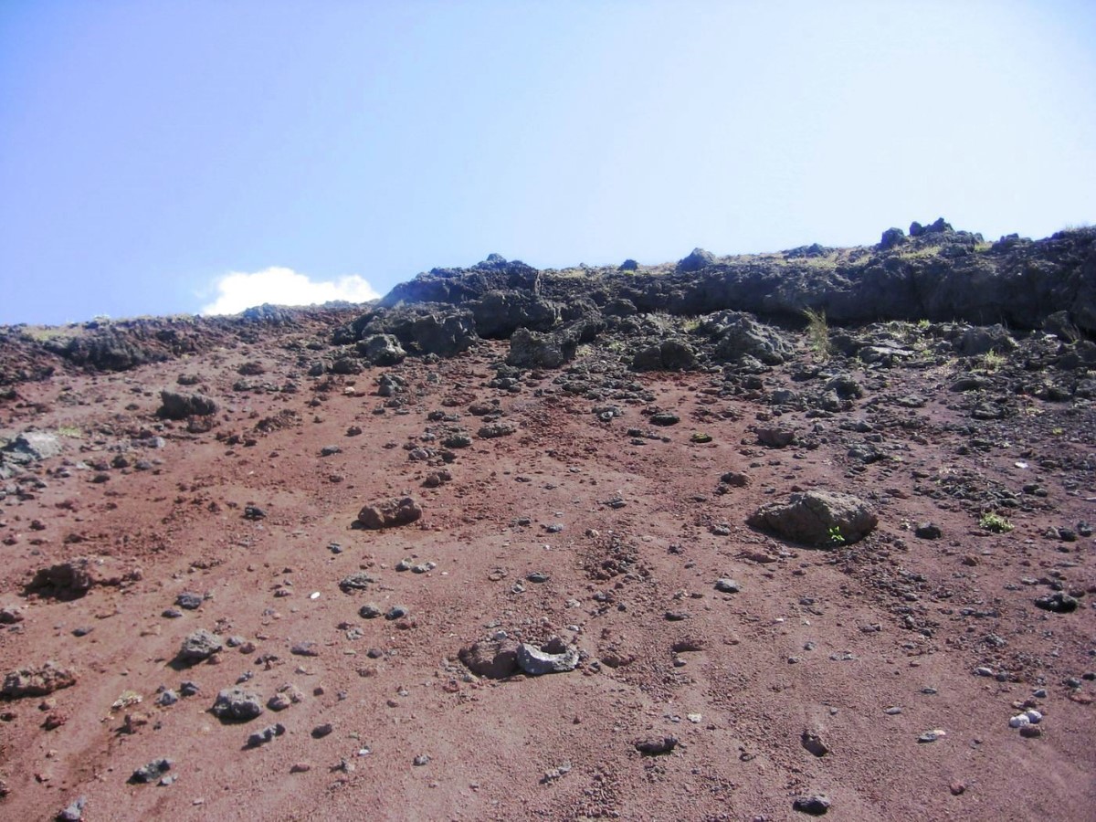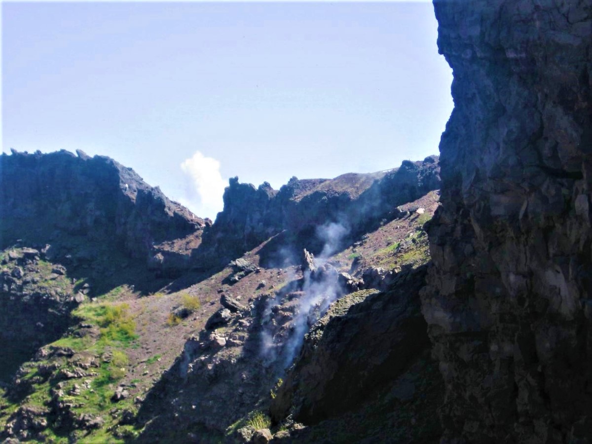 Před vrcholem jsem už měla pocit, že tam budu muset dolézt holt po čtyřech. Ale zvládla jsem to s vypětím všech sil – byla jsem zářným příkladem, co všechno vydrží ženská. Nahoře jsem ještě stačila zkontrolovat, jestli se příliš neohřívají ty šutry okolo, nechvěje se mi zem pod nohama a jestli se náhodou nerozmnožuje počet čmoudíků uvnitř kráteru. Ale starouš Vesuv ještě pořád naštěstí  dřímal a ti mravenci, co po něm lezli, ho zjevně nezajímali… Pak jsem uviděla stánek se suvenýry a zatoužila koupit si tři lahve pravého neapolského a vypít je okamžitě na ex, abych byla připravena na sestup dolů.