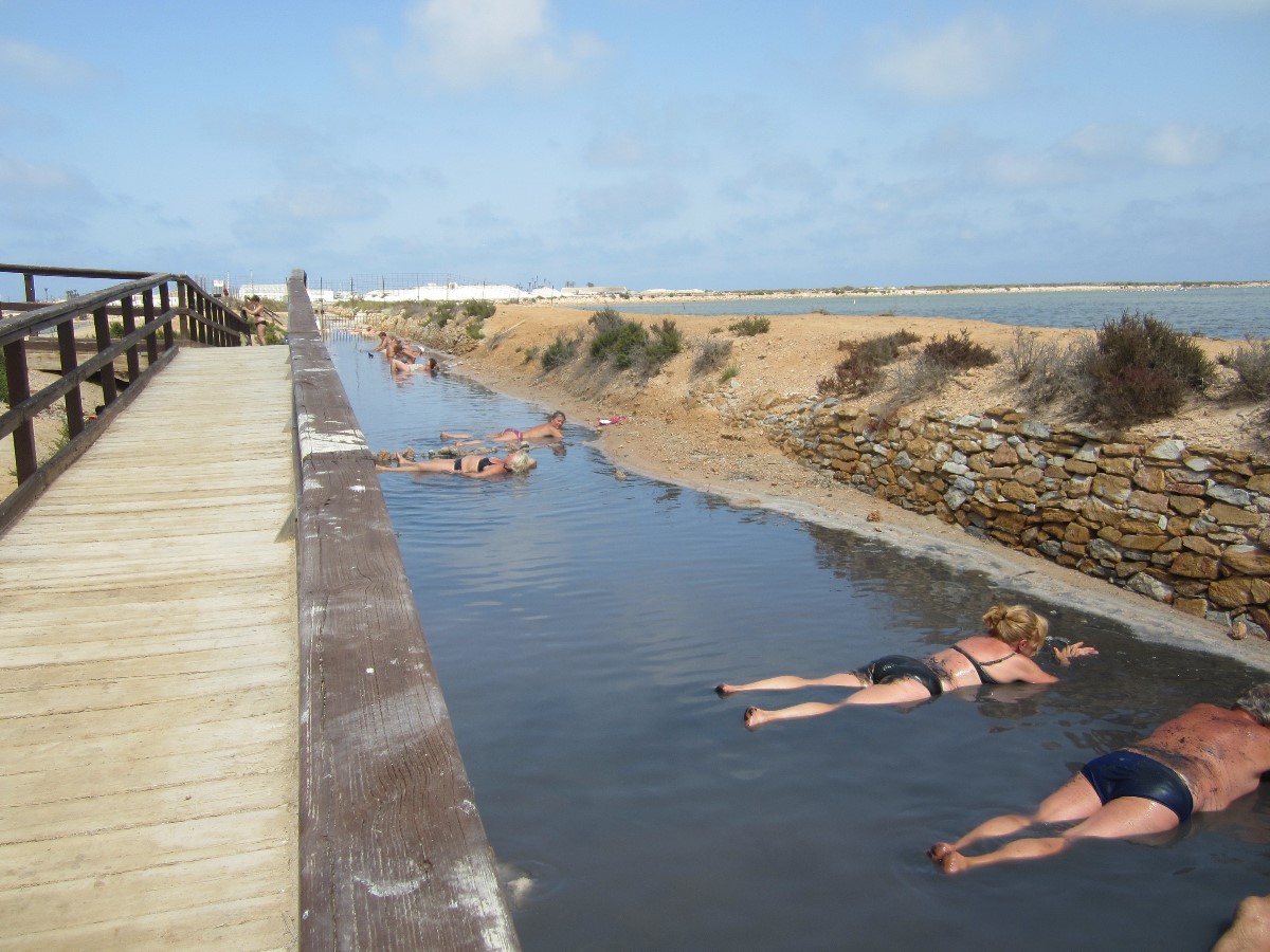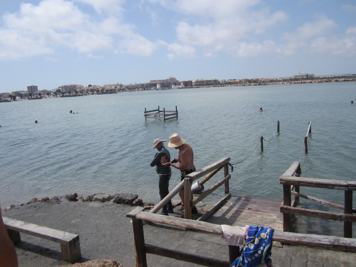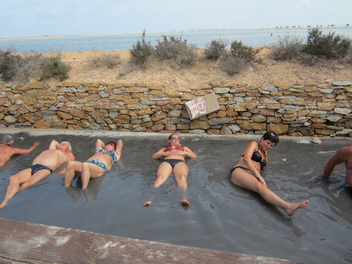 Abych si přeci trochu bahna užila, jela jsem s ostatními do bahenních lázní San Pedro del Pinatar, které jsou vzdáleny od hotelu cca 40 km. Přírodní lázně tvoří nádrže s teplou vodou a na dně je bahno. Ale nejprve se musí lidé "namočit" v protékajícím potůčku, kam si lehnou, pod hlavu si dají kámen a leží tam cca půl hodiny. Poté vstupují do bahenní koupele. Já jsem do potůčku nevlezla, vypadal velmi špinavý (plný bahna) a vstup do lázně se mi nelíbil. Ponoření do bahenní vody jsem prostě nezvládla. Raději jsem se šla vykoupat do přilehlého moře.