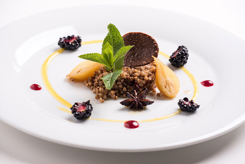 - V malém hrnci rozpustíme cukr, zkaramelizujeme ho, přilijeme bílé víno, přidáme badyán a hřebíček a necháme vše svařit do sladkého nálevu. Pak koření odstraníme a do nálevu přidáme uvařenou pohanku. Mírně prohřejeme a servírujeme na talíř společně s očištěnou hruškou (kompotovanou nebo povařenou doměkka), zakápneme medem (případně i pomerančovým přelivem), případně čímkoli jiným dle chuti a fantazie.