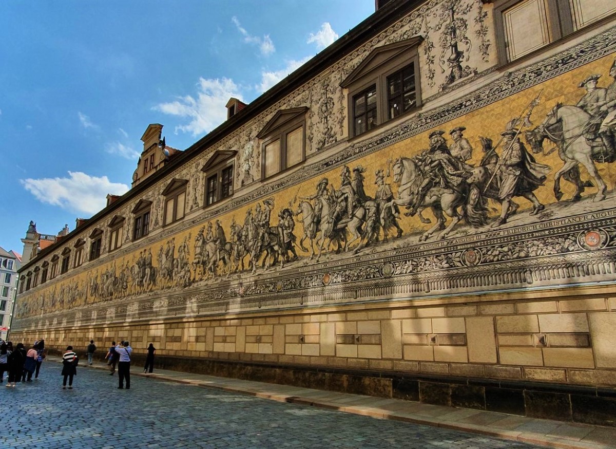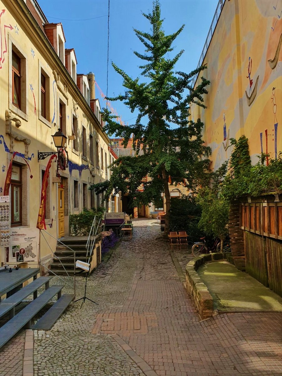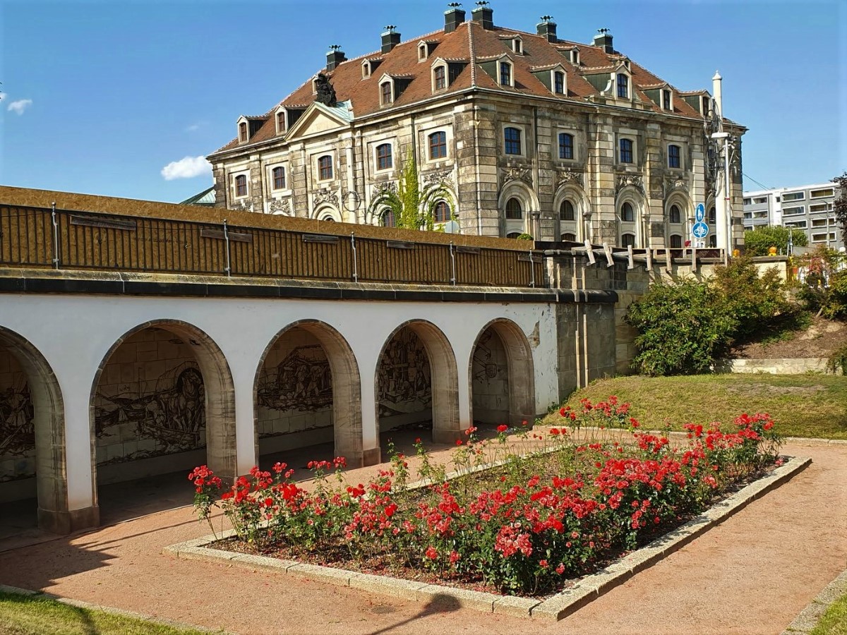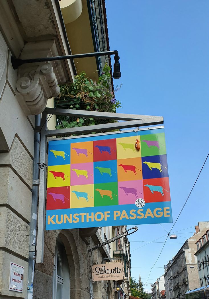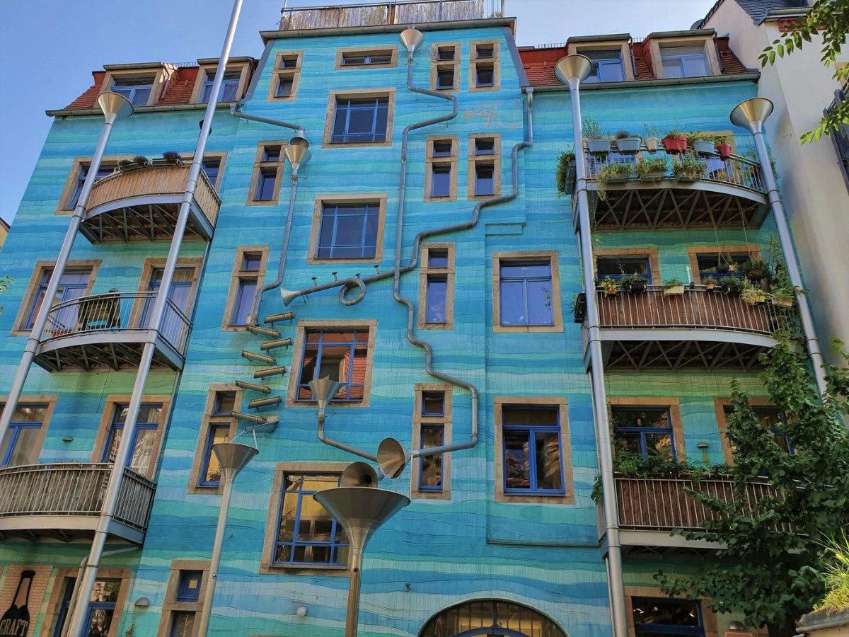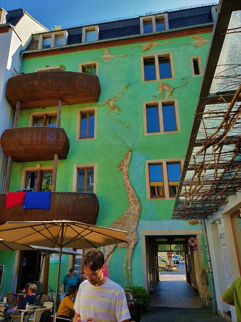 Z Teplic jsme se vydali na výlet do Drážďan. Počítali jsme s tím, že to nemůže být nic dlouhého, protože doma čekal na naše průvodce, co jeli s námi, starý pes, který prý vydrží maximálně tři hodiny (teda než se vrátíme,  jinak začne vyvádět, ne že mezitím pojde, to na vysvětlenou). Poté jsme se  průvodcům svěřili, neboť naplánovali tentokrát prohlídku “dvorků umělců” (Kunsthof Passage) ve čtvrti Neustadt.