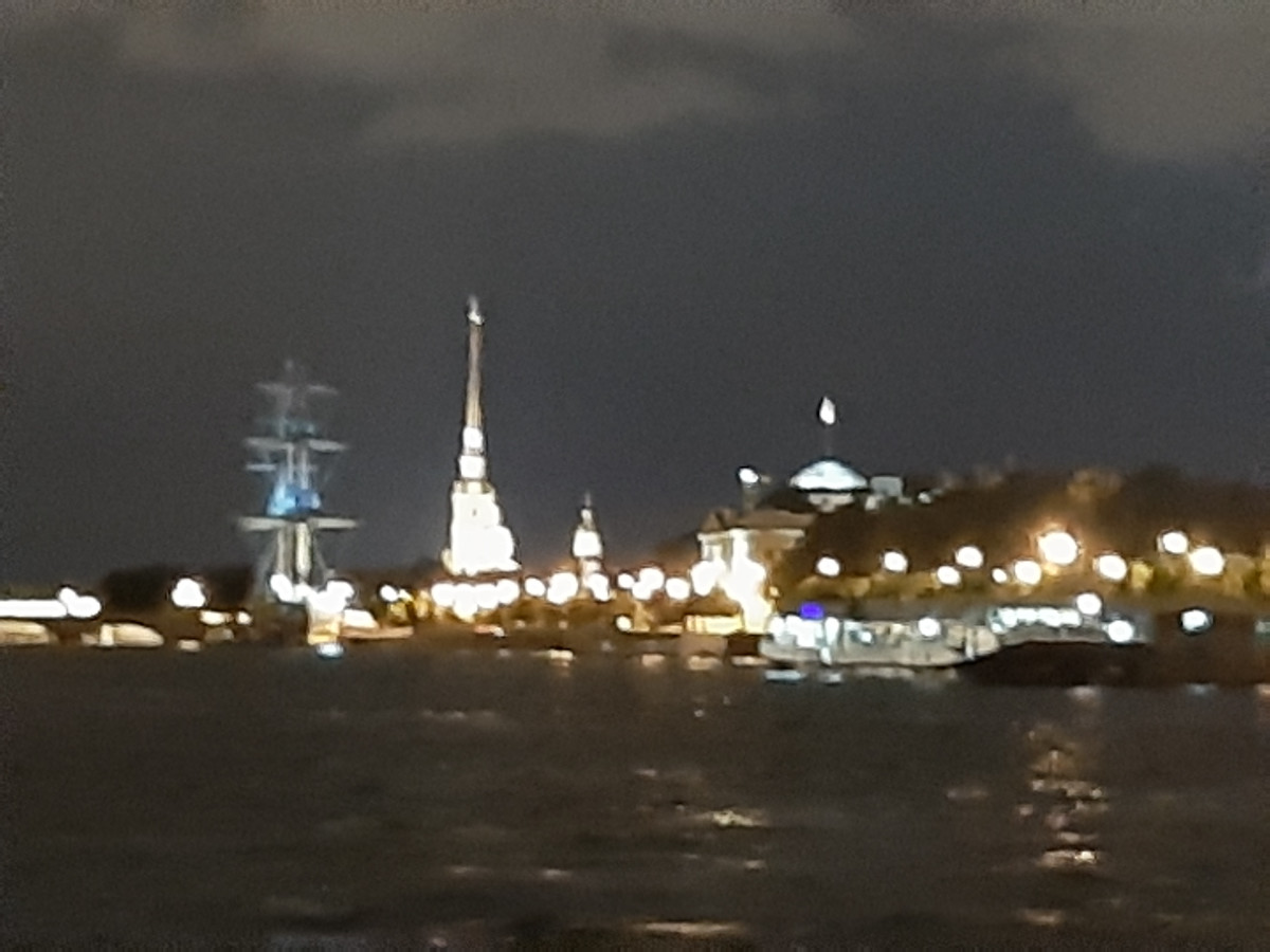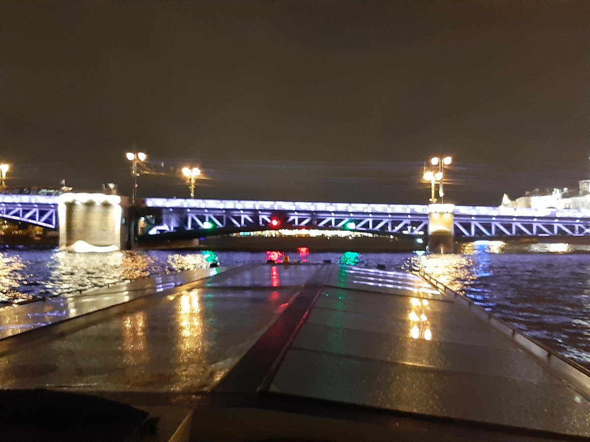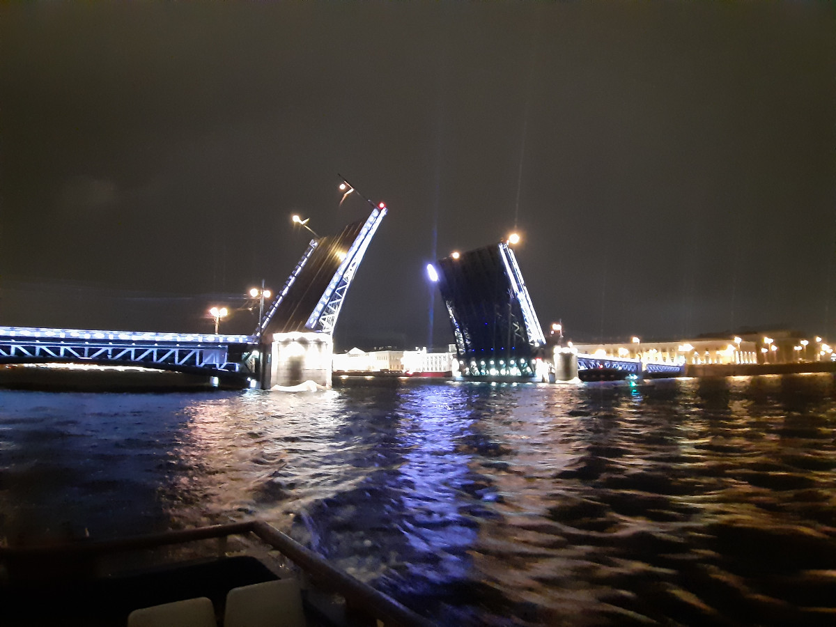 Uvelebili jsme se do křesílek a loď vyplula. Petrohrad v noci je krásný. Nejen obyčejné domy jsou zajímavě nenuceně nasvíceny, ale veškeré památky jsou plně nasvíceny tak, aby doslova vábily k osobní návštěvě. Něva byla plná lodí, ale s ohledem na velikost jsme nebyli tak namačkáni, jako lodě na Vltavě v Praze. Dopluli jsme za doprovodu živé hudby na palubě k mostu, jenž svou velikostí je impozantní. Byl barevně nasvícen a před ním a za ním byly zakotveny lodě s turisty, a čekali jsme na vrchol ranního večera. Zvednutí středové části mostu pro nákladní lodní dopravu. Mosty v Petrohradu nejsou moc vysoké. Z paluby lodě, když poposkočíte, se dotknete prsty spodku mostů. Ozval se zvon, a obě části mostu se začaly zvedat. Dívali jsme se s úctou na mohutné poloviny mostu, které se i s osvětlením zvedaly. Představu mám velkou, ale tu sílu hydrauliky, co zvedala most, jsem si neuměl představit. Podpluli jsme otevřený most, loď se otočila a pluli jsme nazpátek do přístavu, jenž se nacházel v malém doku říčky, která protínala Petrohrad. A opět samé nasvícené budovy a kostelíky, úžasné chvilky poznávání. Vystoupili jsme z lodě a najednou se nám nechtělo ani na hotel. Ale museli jsme.