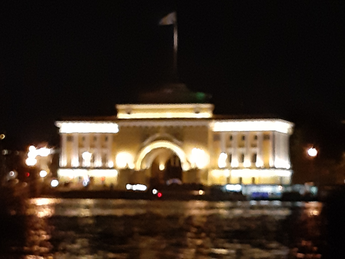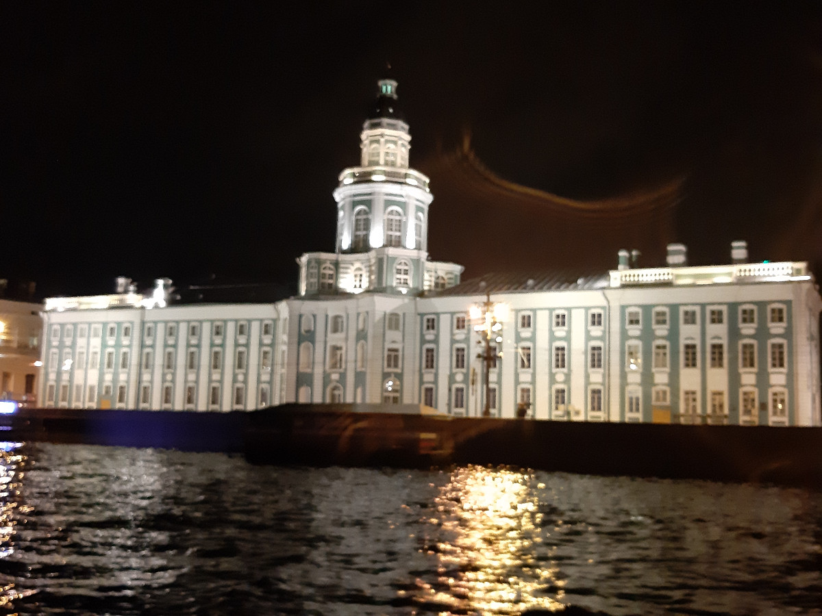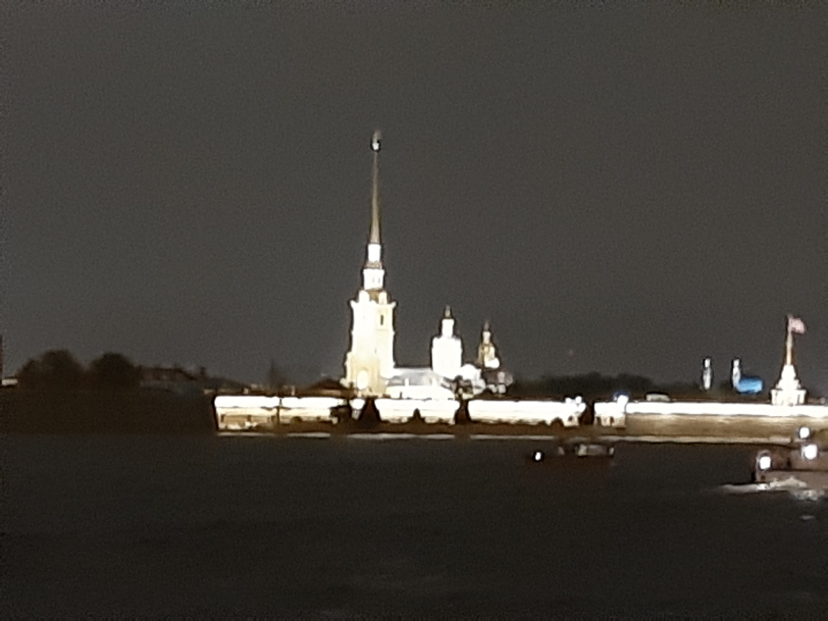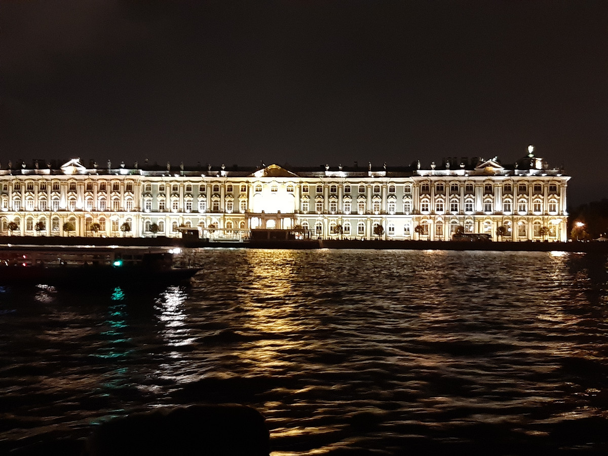 Uvelebili jsme se do křesílek a loď vyplula. Petrohrad v noci je krásný. Nejen obyčejné domy jsou zajímavě nenuceně nasvíceny, ale veškeré památky jsou plně nasvíceny tak, aby doslova vábily k osobní návštěvě. Něva byla plná lodí, ale s ohledem na velikost jsme nebyli tak namačkáni, jako lodě na Vltavě v Praze. Dopluli jsme za doprovodu živé hudby na palubě k mostu, jenž svou velikostí je impozantní. Byl barevně nasvícen a před ním a za ním byly zakotveny lodě s turisty, a čekali jsme na vrchol ranního večera. Zvednutí středové části mostu pro nákladní lodní dopravu. Mosty v Petrohradu nejsou moc vysoké. Z paluby lodě, když poposkočíte, se dotknete prsty spodku mostů. Ozval se zvon, a obě části mostu se začaly zvedat. Dívali jsme se s úctou na mohutné poloviny mostu, které se i s osvětlením zvedaly. Představu mám velkou, ale tu sílu hydrauliky, co zvedala most, jsem si neuměl představit. Podpluli jsme otevřený most, loď se otočila a pluli jsme nazpátek do přístavu, jenž se nacházel v malém doku říčky, která protínala Petrohrad. A opět samé nasvícené budovy a kostelíky, úžasné chvilky poznávání. Vystoupili jsme z lodě a najednou se nám nechtělo ani na hotel. Ale museli jsme.