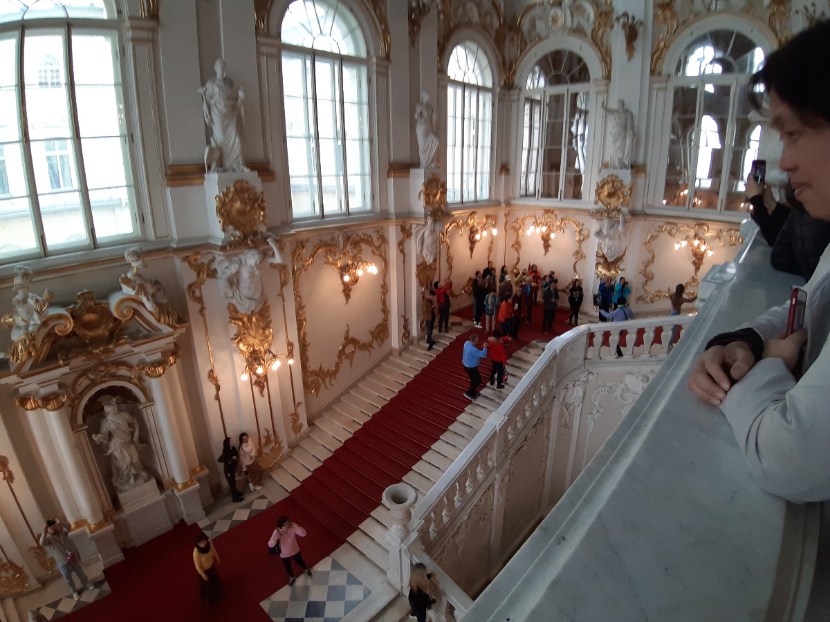 Samý čínský turista, místo zbraní každý na krku fotoaparáty s objektivy, a před nimi vedoucí útoku s vlaječkou a názvem skupiny, aby nezabloudili na tak velké ploše. Stáli ve frontě do Zimního paláce, vchod byl na velikost budovy malý, a tak vstup byl dost v plynulosti průchodu omezen, protože uvnitř skupiny ještě stáli frontu na audio průvodce.