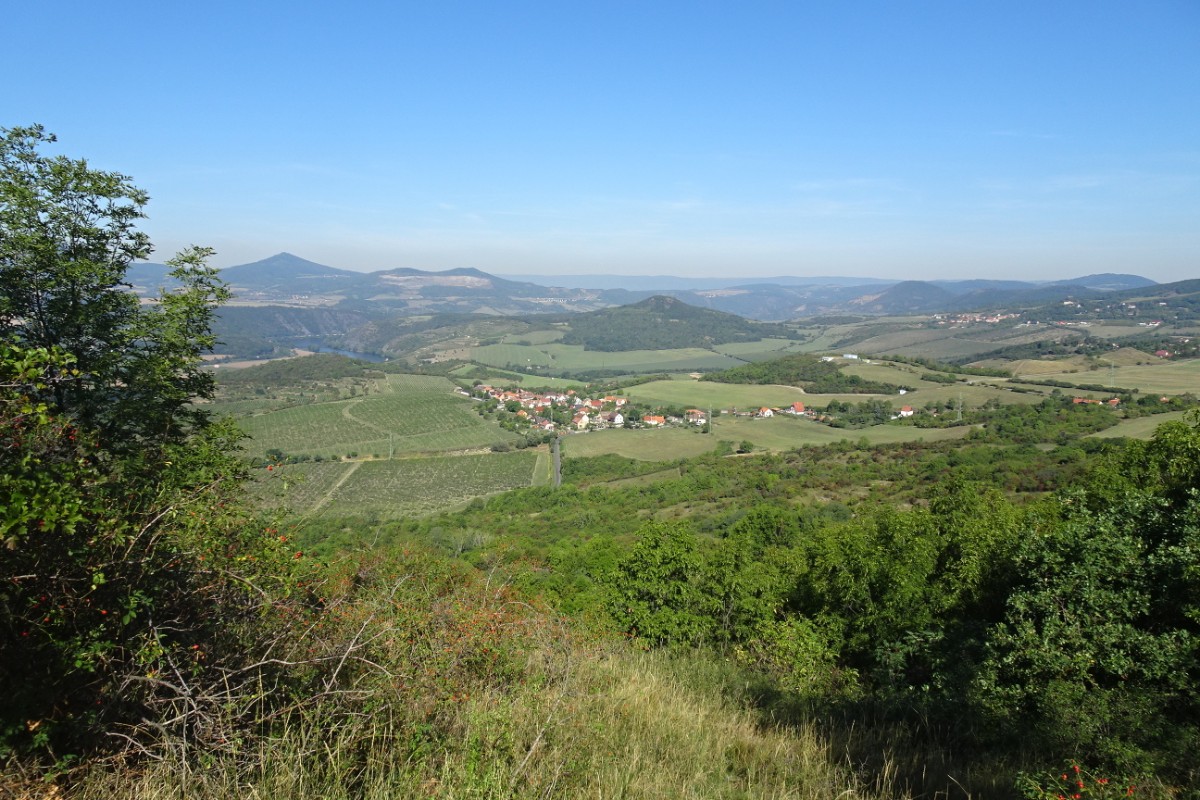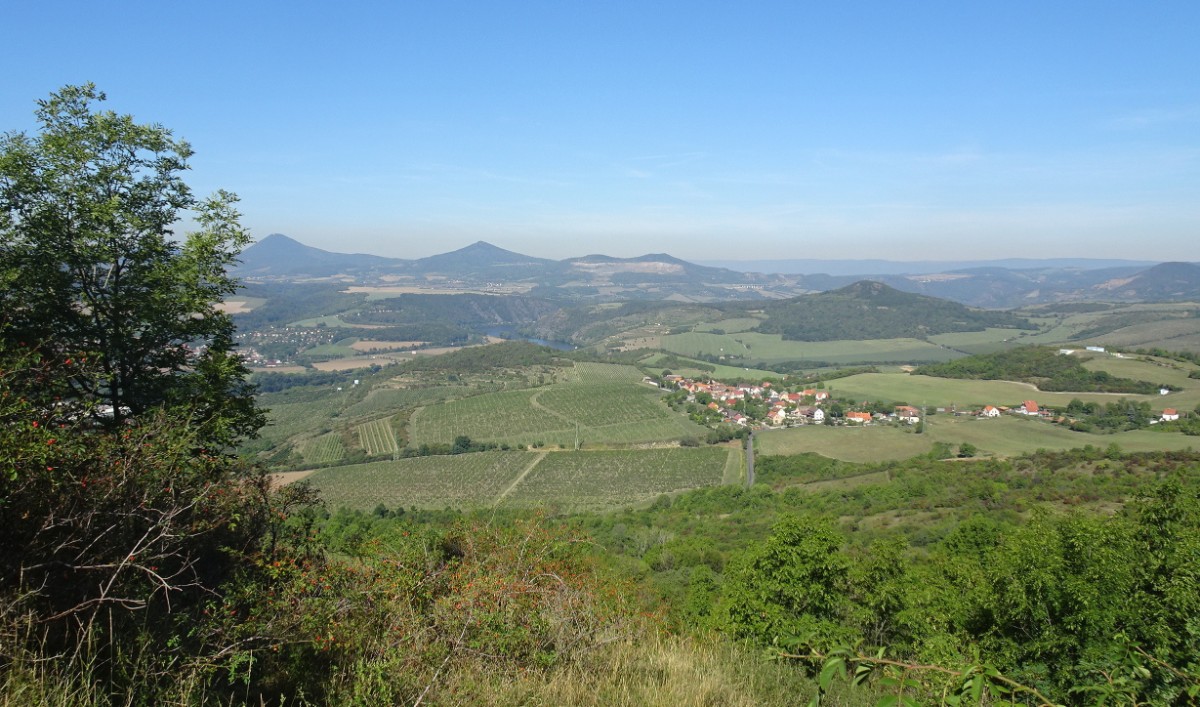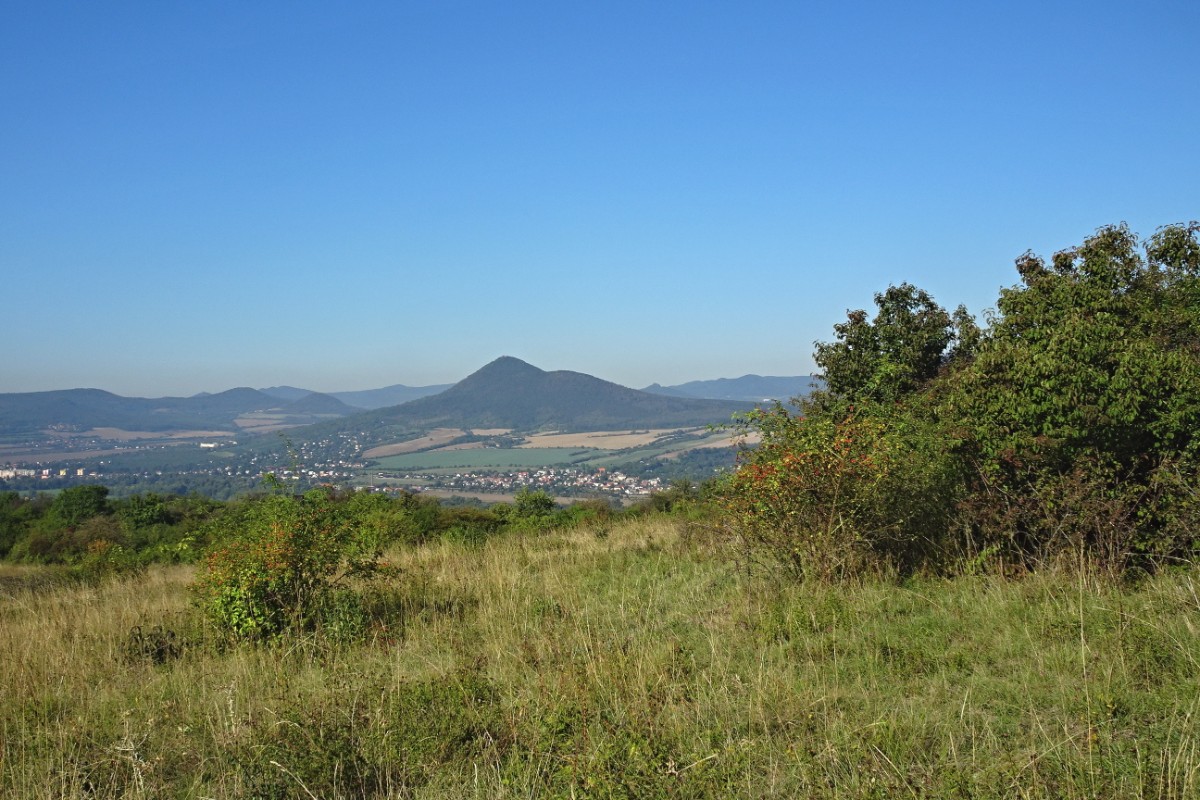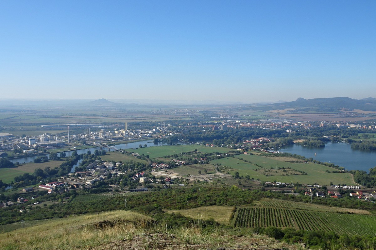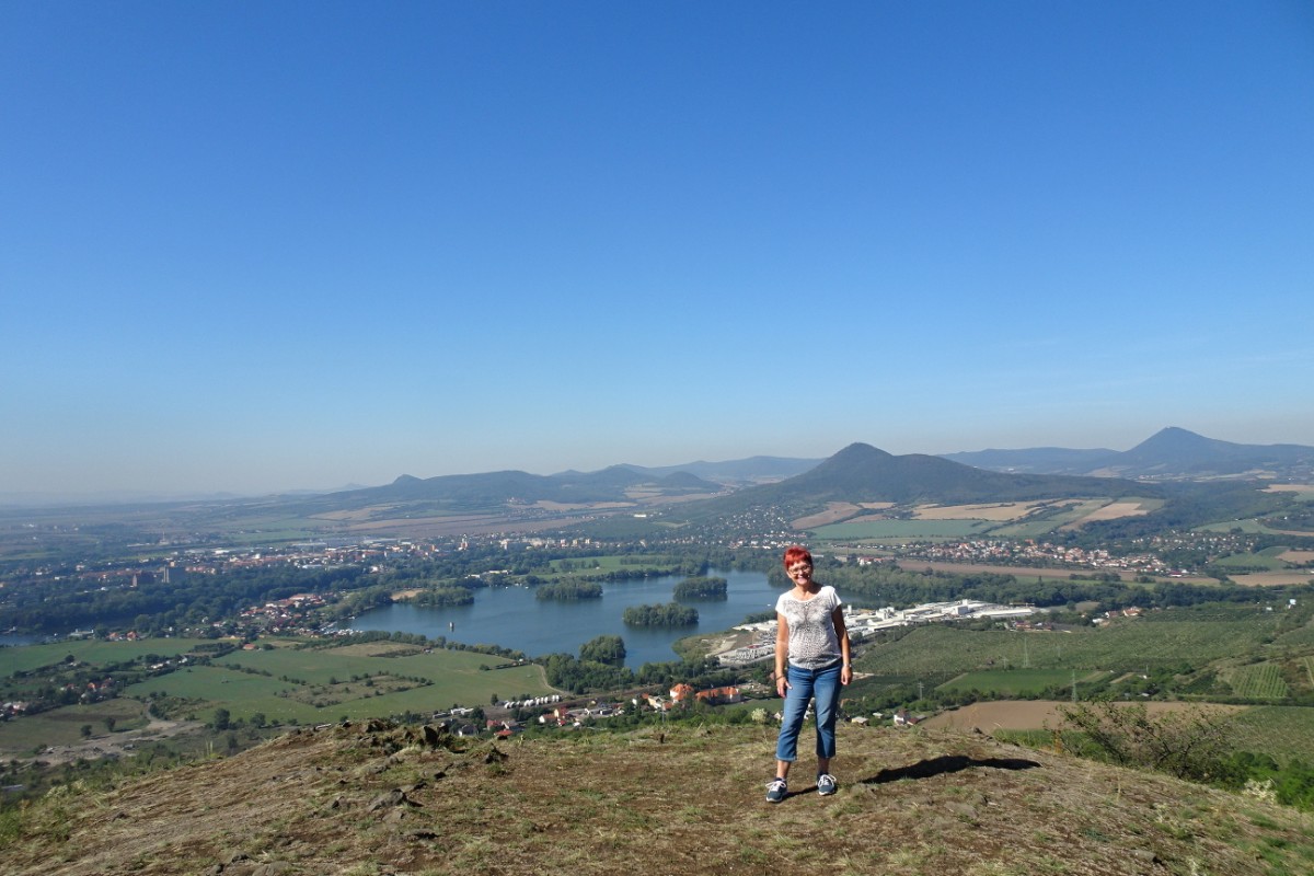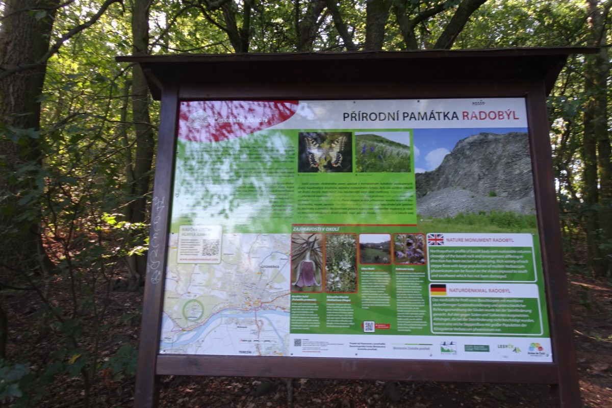 Nějaký ten pátek už jsem na něm nebyla a natěšeně jsem čekala na vhodný den s pěknou viditelností. Ve středu 4. září ráno sluníčko svítilo a slibně na mě mrkalo. V Litoměřicích jsem se sešla se svou kamarádkou, turistkou Věrou, a vyrazily jsme. Od silnice vede pěšina loukou. Na úpatí jsme se rozhodly podívat se nejdřív na dno onoho zdaleka viditelného zubu, způsobeného těžbou kamene. Skalní stěna je učebnicovou ukázkou sloupcové odlučnosti čediče. Pokochaly jsme se výhledem na České středohoří a vystoupaly "o patro výš", tj. na samé temeno Radobýlu s kovovým křížem. Věřte mi, srdce tu usedá a nechce se Vám odtrhnout oči od té krásy od obzoru k obzoru. Říp, Házmburk, Lovoš, Milešovka a nepřeberné množství středohorských kopců a kopečků. Pod námi se rozprostírá Žernosecké jezero. Méně úchvatný pohled je na továrnu Lovochemie v Lovosicích a panelárnu v Žalhosticích. Čas letěl a my jsme musely pokročit dál. Vrátily jsme se k silnici a těsně před Michalovicemi odbočily k tzv. třem vrškům. Jsou to takové zelené pupínky s překrásnými výhledy. Slezly jsme hezky jeden po druhém, na každém chviličku poseděly a pokračovaly dál přes osadu Knobloška k Bídnici. Tento vrch jsme přešly hezky po louce až k lesu na jejím vršku a podle lesa pomalu scházely do zahrádkářské kolonie na kraji Litoměřic. Pokračovaly jsme dál ke vchodu do neblaze proslulé továrny Richard zbudované právě v útrobách Bídnice. Jistě všichni víte, že tady v bývalém dole vybudovali nacisté ke konci války utajenou podzemní továrnu na výrobu zbraní. O život tu nedobrovolně přišlo mnoho lidí. Čekala jsem pietní místo, ale stály jsme před těžkými vraty. V ne zrovna upraveném prostředí je tabule s informacemi o Richardu. Kamarádka mi vyprávěla, že pamatuje jako dítě, že tam ještě byly koleje a odstavené těžební vozíky.