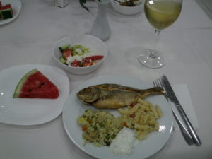 Jenom ještě podotknu, že autobus tentokrát přijel přesně. A k večeři nám na hotelu dali – no samozřejmě, rybu, jak jinak. Za celý pobyt jsme měli k večeři rybu jedenkrát – a to zrovna v tento den.