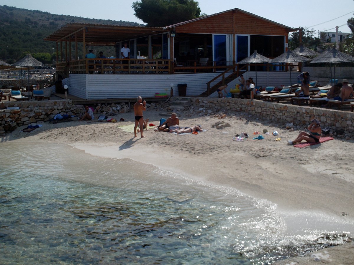 Saranda je přístavní město, umístěné v zátoce na prudkých svazích. Zátoku lemují úzké pláže, domy a hotely stoupají po svazích vzhůru. Uličky jsou rovněž úzké a přecpané auty a turisty. Kličkovaly jsme mezi nimi a obhlížely okolí. Nakonec jsme se rozhodly zakotvit někde na oběd. Líbila se nám restaurace pod banánovníky, a dobře jsme udělaly.
