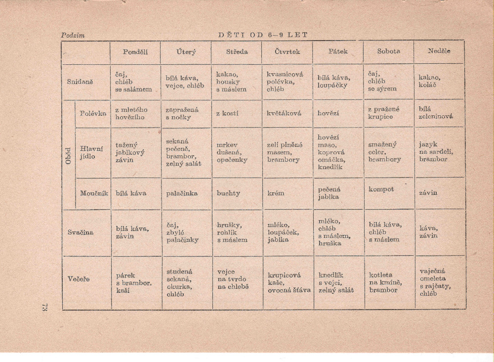 Nedílnou součástí knihy je odborný úvod teoretika stravování s nezbytným ideologickým podtextem, vždyť jsme v padesátých letech minulého století. Dále kniha pokračuje podrobnými celotýdenními jídelníčky. V případě obědů je to často maso. Nevím jak vy, ale já si jako hodně malá pamatuji, že maminka v Brně chodila v pátek ještě za tmy do fronty před masnu na tehdejší Gagarinovu ulici, aby měla v neděli z čeho vařit. Při pročítání těchto jídelníčků mi v mysli vytanulo několik dalších vzpomínek. Třeba na jedno úterní ráno autorka k snídani doporučuje švédský čaj – čaj s mlékem. Jednou mi jej babička také připravila. Naštěstí byla v kuchyni výlevka, a tak, jak se babička otočila, vylila jsem nápoj do ní. Prošlo mi to. Přečin zůstal utajen. To navrhovaný chléb s maceškou, to je jiná. Ještě, že si výtečnou můžeme koupit při cestách do Prahy v masně pod Jindřišskou věží. Lákavé jsou i zapečené palačinky s tvarohem, pečená jablka nebo nedělní moučník – sněhové pusinky s krémem ze žervé. Mimo moji fantazii je ale jeden pondělní oběd vhodný pro děti od tří do šesti let, a sice mozečková sedlina s bramborem. Ale kdo ví. Nikdy jsem neochutnala. To na oplatkový dort si z dětství vzpomínám velmi dobře. Zde je dobový recept přesně podle Jozy Břízové.