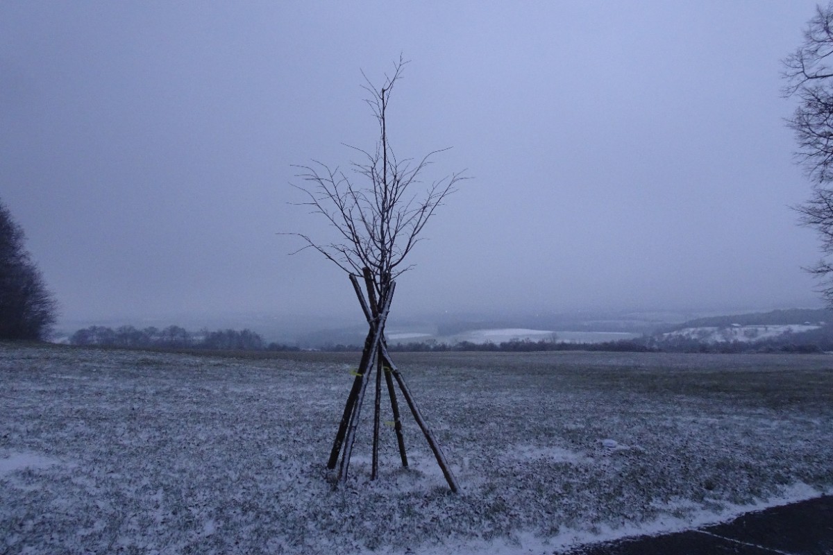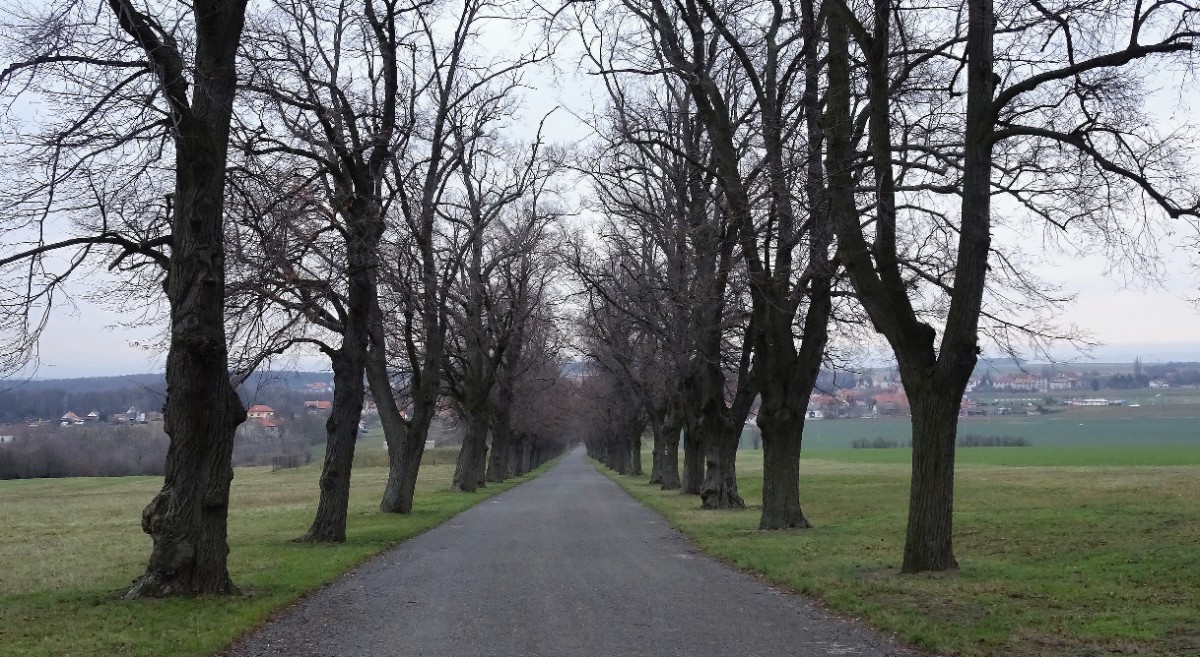 U nás v Roudnici panoval běžný obrázek Podřipské zimy - nad nulou, ale chladno, vlezlo, tmavá mračna pomalu k zemi, lustr může svítit celý den. Stejně nevlídný obrázek se naskýtal i  v Rovném na začátku aleje k Řípu. Alej bez jediného lístečku na stromě spí, odpočívá a nabírá síly.