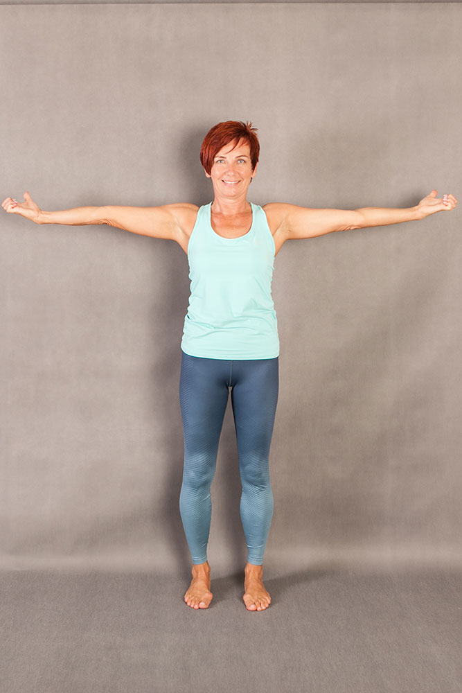 Postavte se rovně, kyčle, kolena a chodidla jsou v jedné linii, chodidla směřují dopředu. Upažte a stáhněte lopatky k sobě. Ramena i lopatky tlačte dolů směrem k pasu. Zpevněte všechny svaly na pažích. Nedávejte ruce v pěst, pouze pokrčte první články prstů a snažte se co nejvíce protáhnout svaly na dlaních, palce vztyčte.