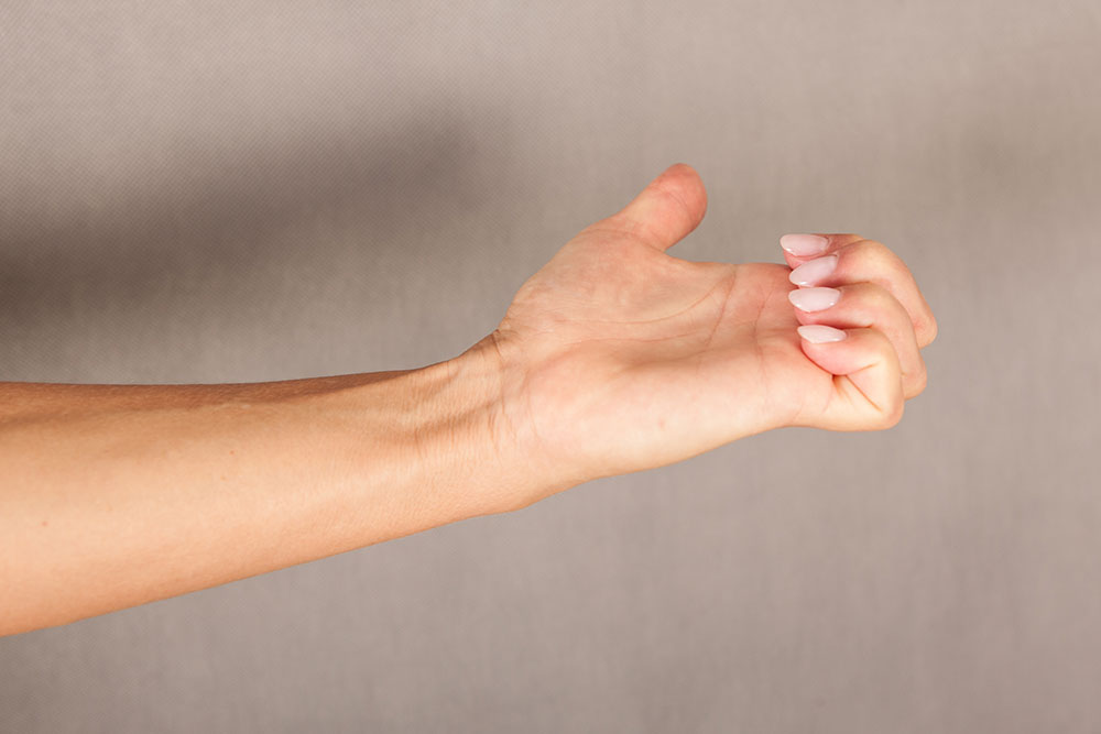 - Hřbety rukou směřují dolů, dlaně jsou vzhůru, palce vzad.