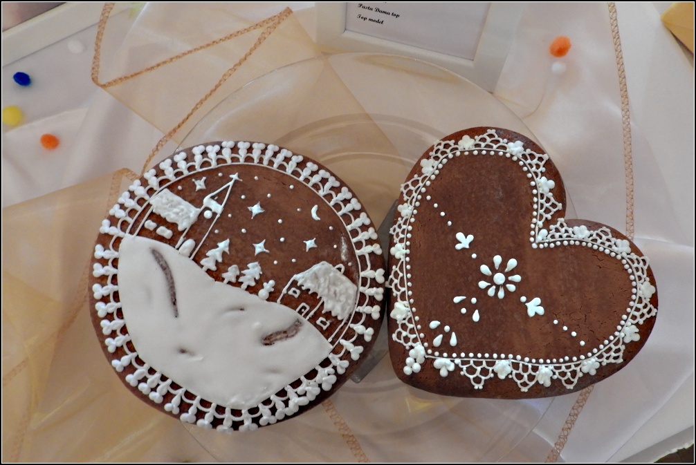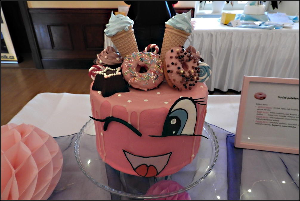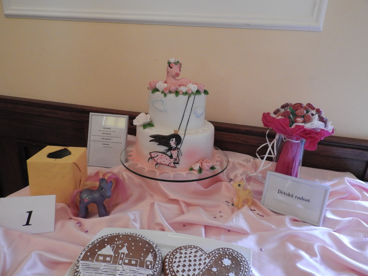 Soutěžilo se ve třech kategoriích. Na svých fotografiích vám přiblížím dvě kategorie, dorty a zdobení perníků. Třetí kategorií byly zdobené lívanečky, tyto však na svých fotkách nemám. Téma na zhotovení dortů bylo: Dětská radost.